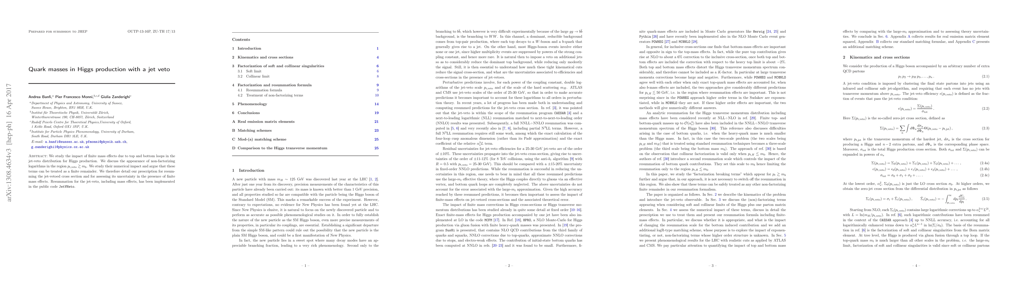 Researchers studied how finite mass effects in top and bottom particles affect Higgs production with a jet veto, finding that these effects can be treated as a small remainder and resummed for more accurate calculations.