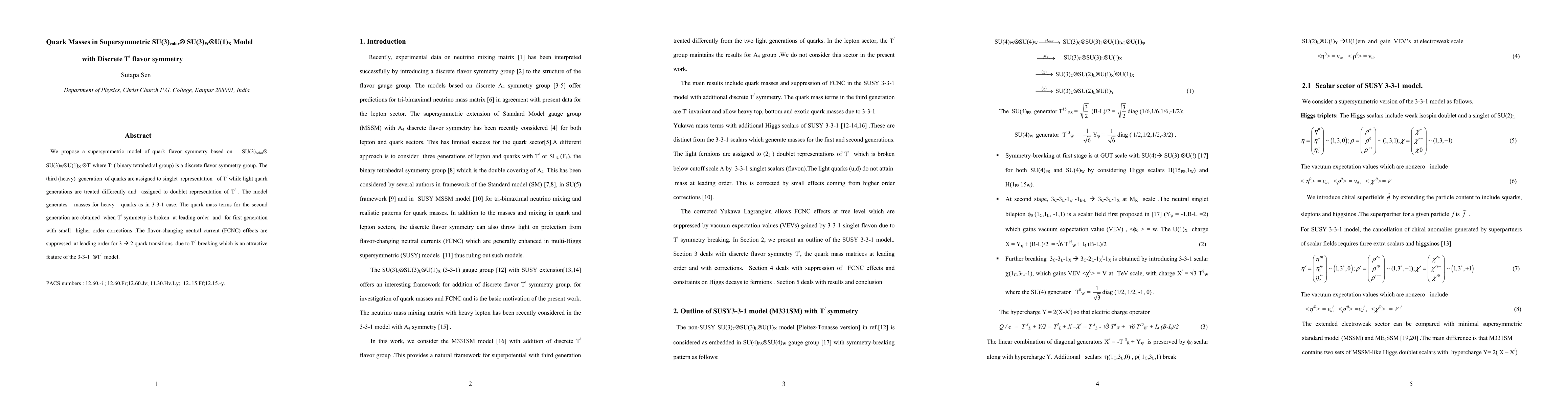 This supersymmetric model proposes a new quark flavor symmetry with discrete T' group, generating masses for heavy quarks as in 3-3-1 cases, while suppressing FCNC effects.