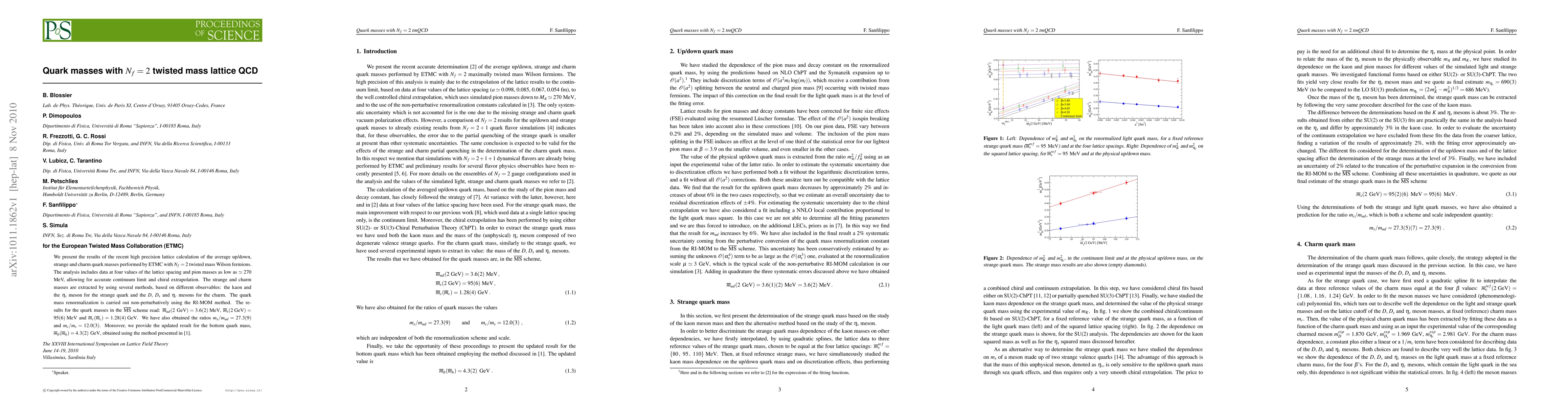 We present the results of the recent high precision lattice calculation of the average up/down, strange and charm quark masses performed by ETMC with Nf=2 twisted mass Wilson fermions. The analysis includes data at four values of the lattice spacing and pion masses as low as ~270 MeV, allowing for accurate continuum limit and chiral extrapolation. The strange and charm masses are extracted by using several methods, based on different observables: the kaon and the eta_s meson for the strange quark and the D, D_s and eta_c mesons for the charm. The quark mass renormalization is carried out non-perturbatively using the RI-MOM method. The results for the quark masses in the MSbar scheme read: m_ud(2 GeV)= 3.6(2) MeV, m_s(2 GeV)=95(6) MeV and m_c(m_c)=1.28(4) GeV. We have also obtained the ratios m_s/m_ud=27.3(9) and m_c/m_s=12.0(3). Moreover, we provide the updated result for the bottom quark mass, m_b(m_b)=4.3(2) GeV, obtained using the method presented in 0909.3187 [hep-lat].
