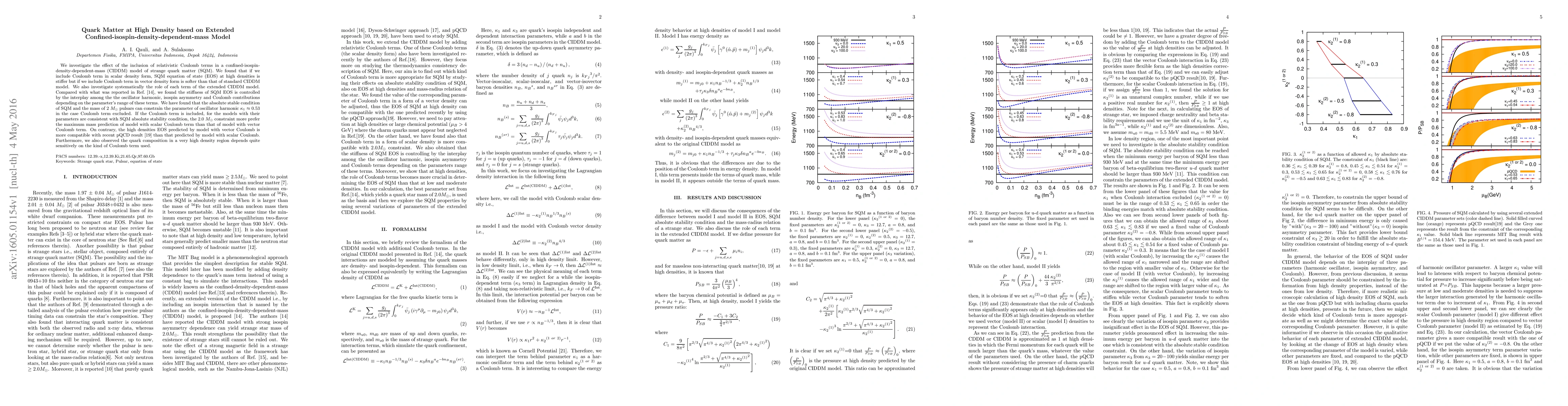 We investigate the effect of the inclusion of relativistic Coulomb terms in a confined-isospin-density-dependent-mass (CIDDM) model of strange quark matter (SQM). We found that if we include Coulomb term in scalar density form, SQM equation of state (EOS) at high densities is stiffer but if we include Coulomb term in vector density form is softer than that of standard CIDDM model. We also investigate systematically the role of each term of the extended CIDDM model. Compared with what was reported in Ref.~\cite {ref:isospin}, we found the stiffness of SQM EOS is controlled by the interplay among the the oscillator harmonic, isospin asymmetry and Coulomb contributions depending on the parameter's range of these terms. We have found that the absolute stable condition of SQM and the mass of 2 $M_\odot$ pulsars can constrain the parameter of oscillator harmonic $\kappa_1$ $\approx 0.53$ in the case Coulomb term excluded. If the Coulomb term is included, for the models with their parameters are consistent with SQM absolute stability condition, the $2.0~M_{\odot}$ constraint more prefer the maximum mass prediction of model with scalar Coulomb term than that of model with vector Coulomb term. On contrary, the high densities EOS predicted by model with vector Coulomb is more compatible with recent pQCD result \cite{ref:pressure} than that predicted by model with scalar Coulomb. Furthermore, we also observed the quark composition in a very high density region depends quite sensitively on the kind of Coulomb term used.
