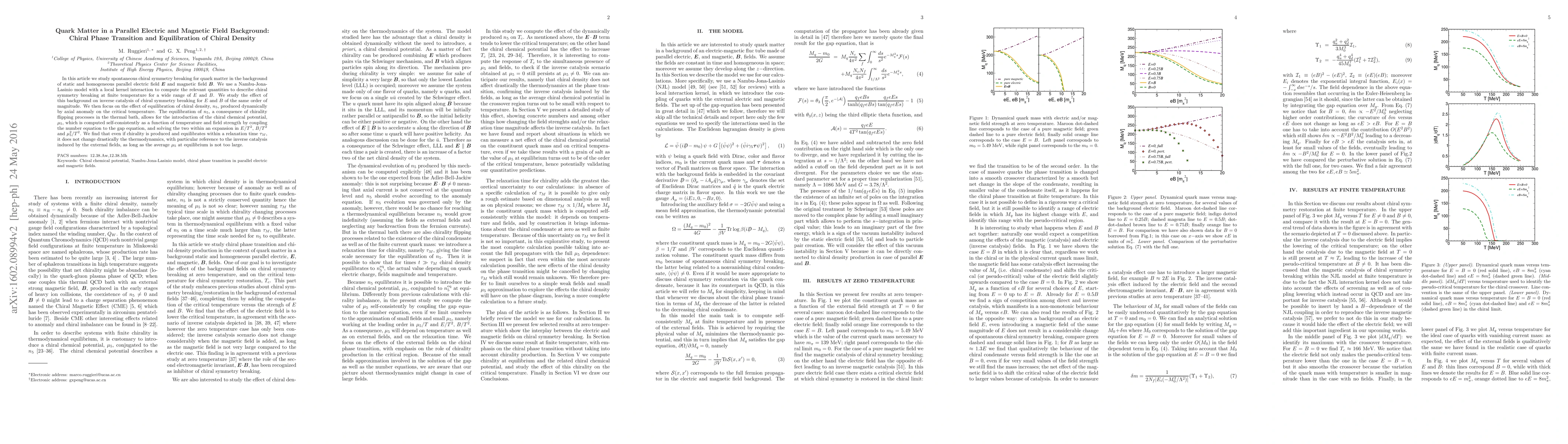 This paper investigates the spontaneous chiral symmetry breaking in quark matter under parallel electric and magnetic fields using a Nambu-Jona-Lasinio model. It finds that equilibration of chiral density, driven by axial anomaly, introduces a chiral chemical potential, $\mu_5$, which does not significantly alter thermodynamics despite the inverse catalysis effect from the fields.