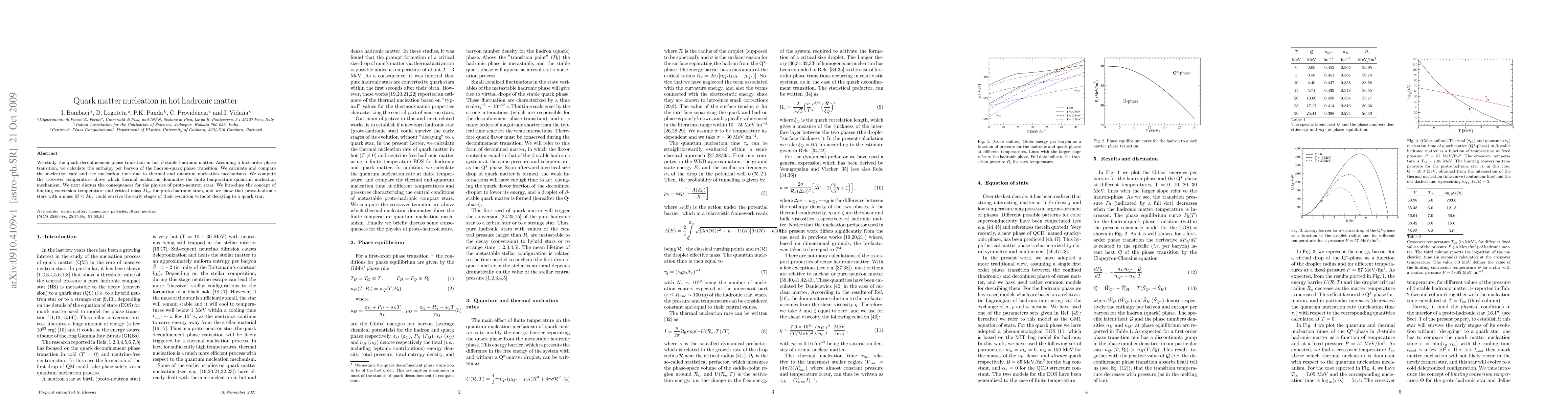 This paper investigates the quark deconfinement phase transition in hot hadronic matter, calculating the nucleation rate and time for both thermal and quantum mechanisms. It finds a crossover temperature where thermal nucleation dominates, and discusses the implications for proto-neutron stars, introducing a critical mass for proto-hadronic stars to avoid decaying into quark stars.