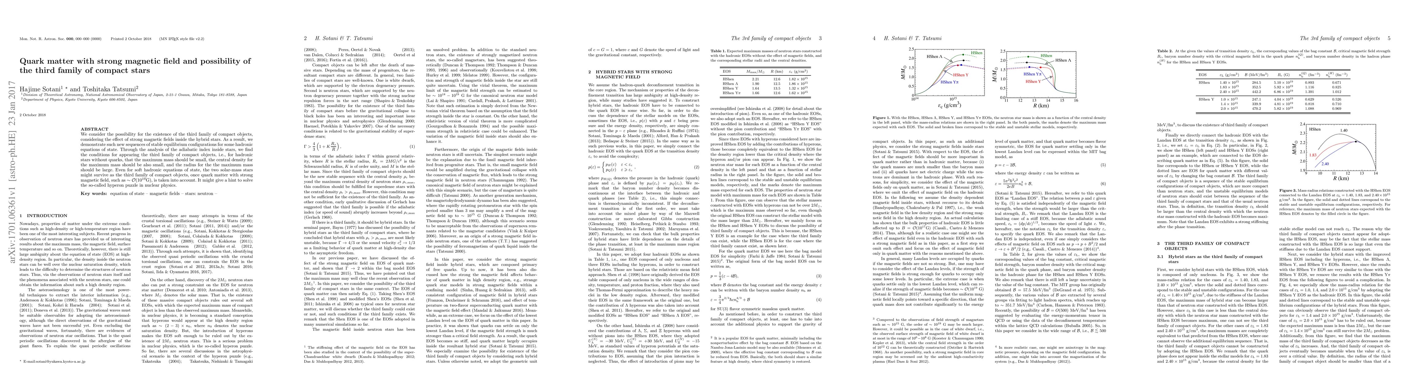 We consider the possibility for the existence of the third family of compact objects, considering the effect of strong magnetic fields inside the hybrid stars. As a result, we demonstrate such new sequences of stable equilibrium configurations for some hadronic equations of state. Through the analysis of the adiabatic index inside stars, we find the conditions for appearing the third family of compact objects, i.e., for hadronic stars without quarks, that the maximum mass should be small, the central density for the maximum mass should be also small, and the radius for the the maximum mass should be large. Even for soft hadronic equations of state, the two solar-mass stars might survive as the third family of compact objects, once quark matter with strong magnetic field, such as $\sim {\cal O}(10^{19} {\rm G})$, is taken into account. It might give a hint to solve the so-called hyperon puzzle in nuclear physics.