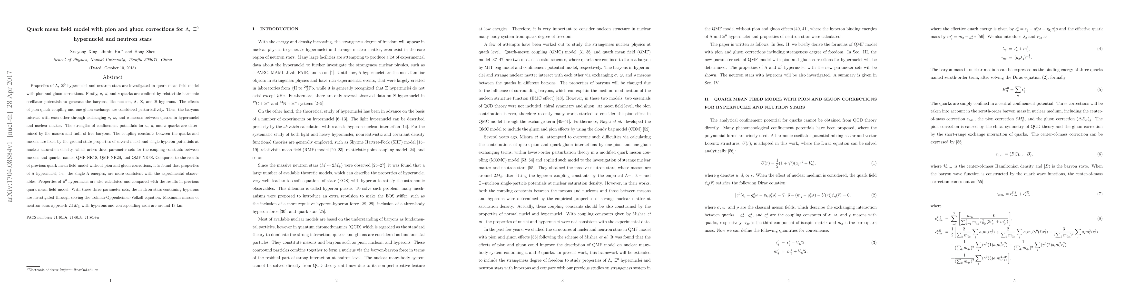 This paper investigates the properties of $\Lambda$ and $\Xi^0$ hypernuclei and neutron stars using a quark mean field model with pion and gluon corrections. The model incorporates $u, d,$ and $s$ quarks confined by relativistic harmonic oscillator potentials, and it considers perturbative pion-quark coupling and one-gluon exchange. The study finds improved consistency of $\Lambda$ hypernuclei properties with experimental data and explores neutron stars' maximum masses up to $2.1M_\odot$ with corresponding radii around $13$ km.