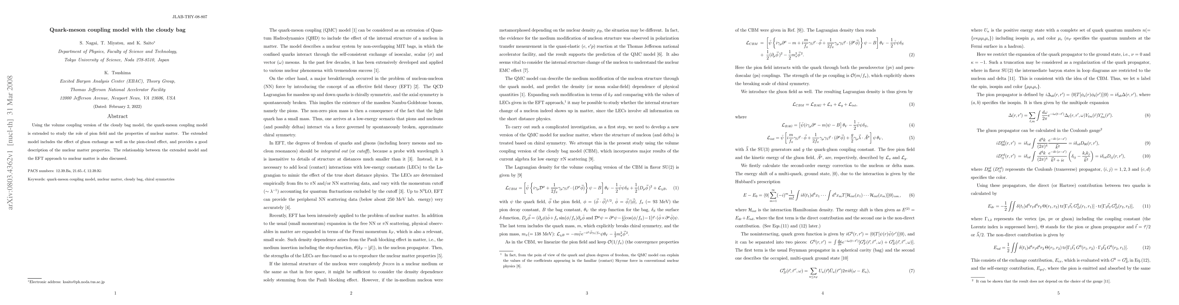 This paper extends the quark-meson coupling model using the cloudy bag model to include pion fields and gluon exchange effects, providing a detailed description of nuclear matter properties and comparing it to the effective field theory approach.