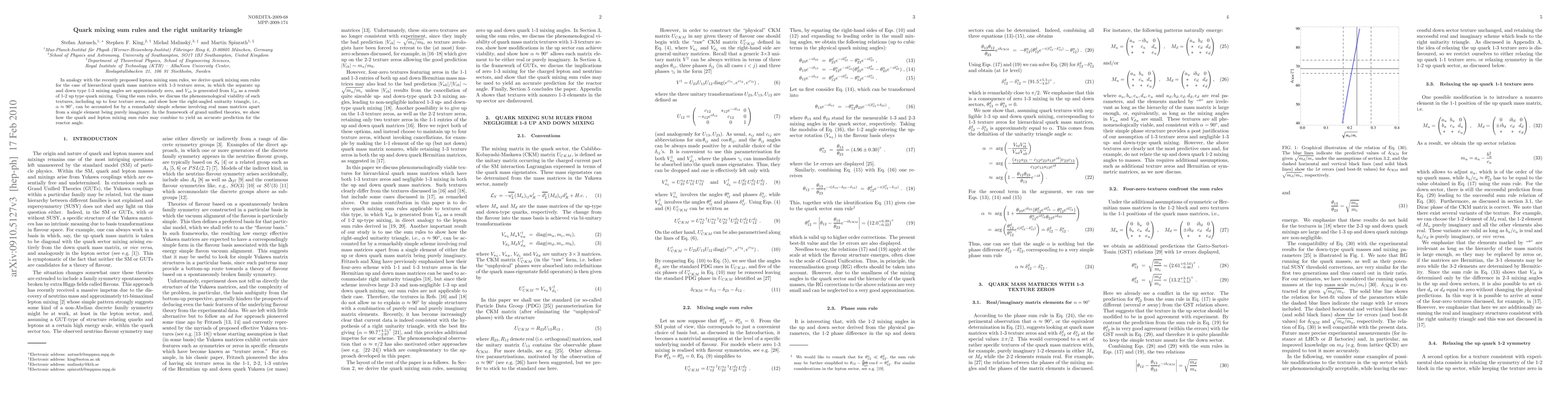 In analogy with the recently proposed lepton mixing sum rules, we derive quark mixing sum rules for the case of hierarchical quark mass matrices with 1-3 texture zeros, in which the separate up and down type 1-3 mixing angles are approximately zero, and $V_{ub}$ is generated from $V_{cb}$ as a result of 1-2 up type quark mixing. Using the sum rules, we discuss the phenomenological viability of such textures, including up to four texture zeros, and show how the right-angled unitarity triangle, i.e., $\alpha \approx 90^\circ$, can be accounted for by a remarkably simple scheme involving real mass matrices apart from a single element being purely imaginary. In the framework of grand unified theories we show how the quark and lepton mixing sum rules may combine to yield an accurate prediction for the reactor angle.