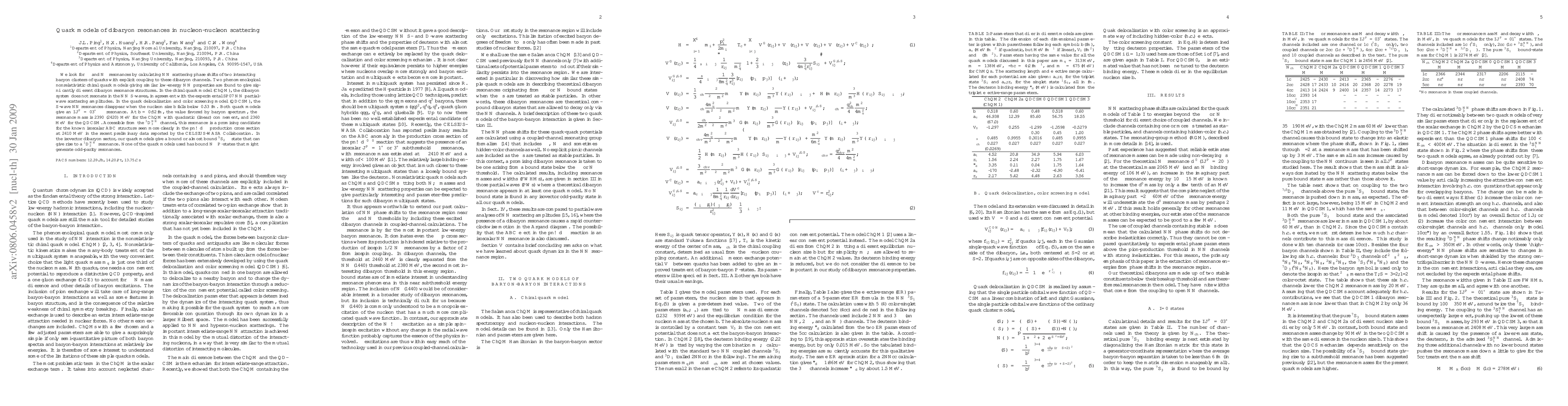 We look for $\Delta\Delta$ and $N\Delta$ resonances by calculating $NN$ scattering phase shifts of two interacting baryon clusters of quarks with explicit coupling to these dibaryon channels. Two phenomenological nonrelativistic chiral quark models giving similar low-energy $NN$ properties are found to give significantly different dibaryon resonance structures. In the chiral quark model (ChQM), the dibaryon system does not resonate in the $NN$ $S$-waves, in agreement with the experimental SP07 $NN$ partial-wave scattering amplitudes. In the quark delocalization and color screening model (QDCSM), the $S$-wave NN resonances disappear when the nucleon size $b$ falls below 0.53 fm. Both quark models give an $IJ^P = 03^+$ $\Delta\Delta$ resonance. At $b=0.52 $fm, the value favored by baryon spectrum, the resonance mass is 2390 (2420) MeV for the ChQM with quadratic (linear) confinement, and 2360 MeV for the QDCSM. Accessible from the $^3D_3^{NN}$ channel, this resonance is a promising candidate for the known isoscalar ABC structure seen more clearly in the $pn$$\to $$d\pi\pi$ production cross section at 2410 MeV in the recent preliminary data reported by the CELSIUS-WASA Collaboration. In the isovector dibaryon sector, our quark models give a bound or almost bound $^5S_2^{\Delta\Delta}$ state that can give rise to a $^1D_2^{NN}$ resonance. None of the quark models used has bound $N\Delta$ $P$-states that might generate odd-parity resonances.