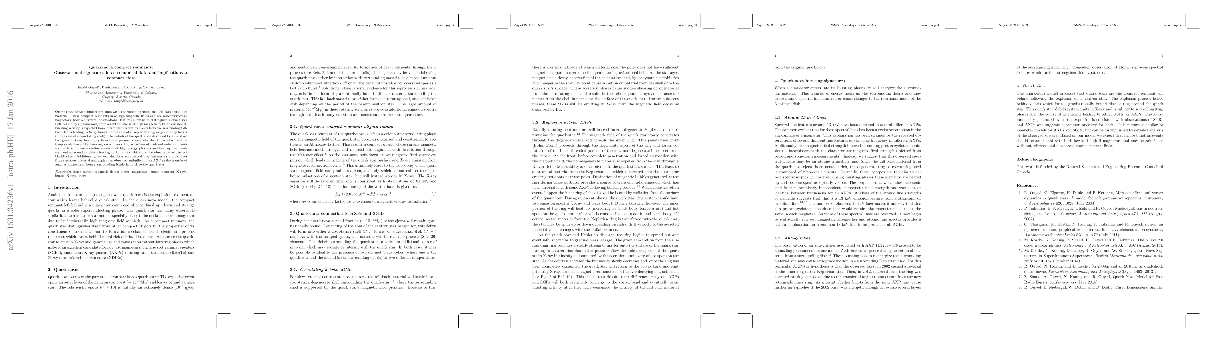 Quark-novae leave behind quark stars with a surrounding metal-rich fall-back (ring-like) material. These compact remnants have high magnetic fields and are misconstrued as magnetars; however, several observational features allow us to distinguish a quark star (left behind by a quark-nova) from a neutron star with high magnetic field. In our model, bursting activity is expected from intermittent accretion events from the surrounding fall-back debris leading to X-ray bursts (in the case of a Keplerian ring) or gamma ray bursts (in the case of a co-rotating shell). The details of the spectra are described by a constant background X-ray luminosity from the expulsion of magnetic flux tubes which will be temporarily buried by bursting events caused by accretion of material onto the quark star surface. These accretion events emit high energy photons and heat up the quark star and surrounding debris leading to hot spots which may be observable as distinct blackbodies. Additionally, we explain observed spectral line features as atomic lines from r-process material and explain an observed anti-glitch in an AXP as the transfer of angular momentum from a surrounding Keplerian disk to the quark star.