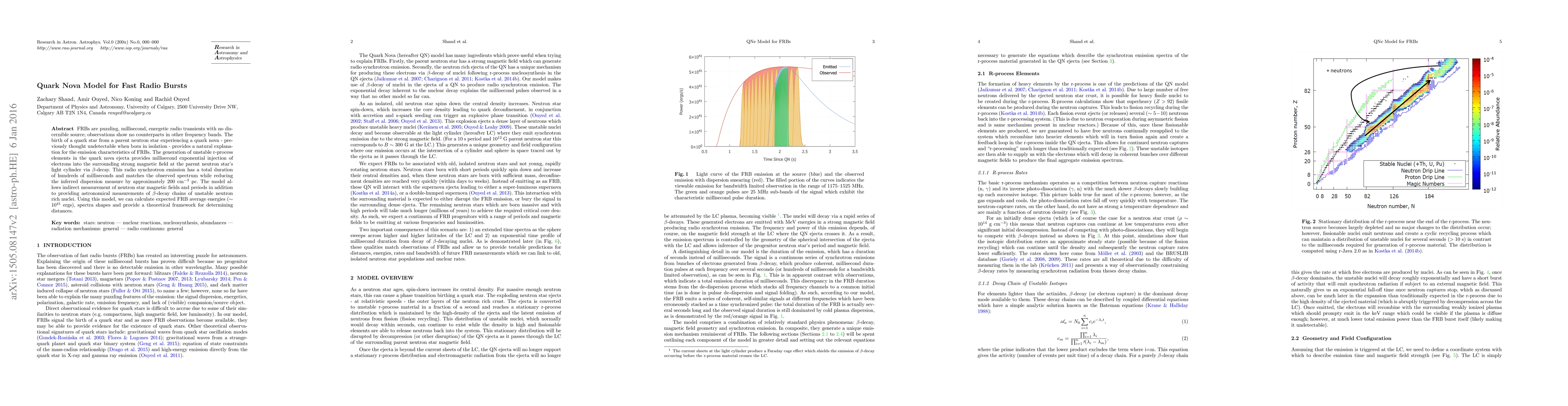 FRBs are puzzling, millisecond, energetic radio transients with no discernible source; observations show no counterparts in other frequency bands. The birth of a quark star from a parent neutron star experiencing a quark nova - previously thought undetectable when born in isolation - provides a natural explanation for the emission characteristics of FRBs. The generation of unstable r-process elements in the quark nova ejecta provides millisecond exponential injection of electrons into the surrounding strong magnetic field at the parent neutron star's light cylinder via $\beta$-decay. This radio synchrotron emission has a total duration of hundreds of milliseconds and matches the observed spectrum while reducing the inferred dispersion measure by approximately 200 cm$^{-3}$ pc. The model allows indirect measurement of neutron star magnetic fields and periods in addition to providing astronomical measurements of $\beta$-decay chains of unstable neutron rich nuclei. Using this model, we can calculate expected FRB average energies ($\sim$ 10$^{41}$ ergs), spectra shapes and provide a theoretical framework for determining distances.