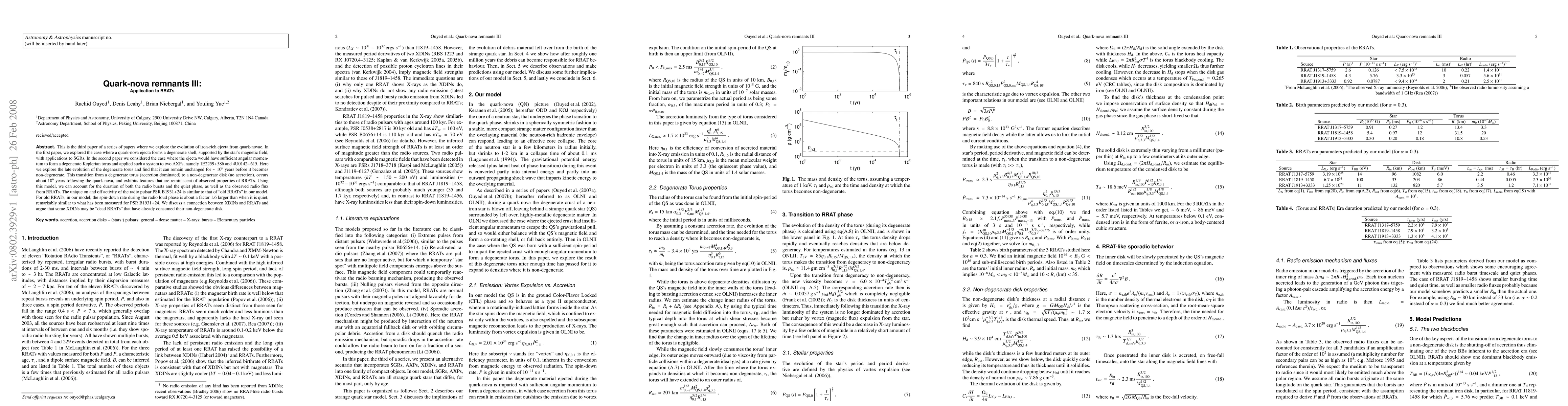 This is the third paper of a series of papers where we explore the evolution of iron-rich ejecta from quark-novae. In the first paper, we explored the case where a quark-nova ejecta forms a degenerate shell, supported by the star's magnetic field, with applications to SGRs. In the second paper we considered the case where the ejecta would have sufficient angular momentum to form a degenerate Keplerian torus and applied such a system to two AXPs, namely 1E2259 + 586 and 4U0142 + 615. Here we explore the late evolution of the degenerate torus and find that it can remain unchanged for $\sim 10^{6}$ years before it becomes non-degenerate. This transition from a degenerate torus (accretion dominated) to a non-degenerate disk (no accretion), occurs about $10^{6}$ years following the quark-nova, and exhibits features that are reminiscent of observed properties of RRATs. Using this model, we can account for the duration of both the radio bursts and the quiet phase, as well as the observed radio flux from RRATs. The unique on and off activity of the radio pulsar PSR B1931 + 24 is similar to that of "old RRATs" in our model. For old RRATs, in our model, the spin-down rate during the radio loud phase is about a factor 1.6 larger than when it is quiet, remarkably similar to what has been measured for PSR B1931 + 24. We discuss a connection between XDINs and RRATs and argue that some XDINs may be ``dead RRATs'' that have already consumed their non-degenerate disk.