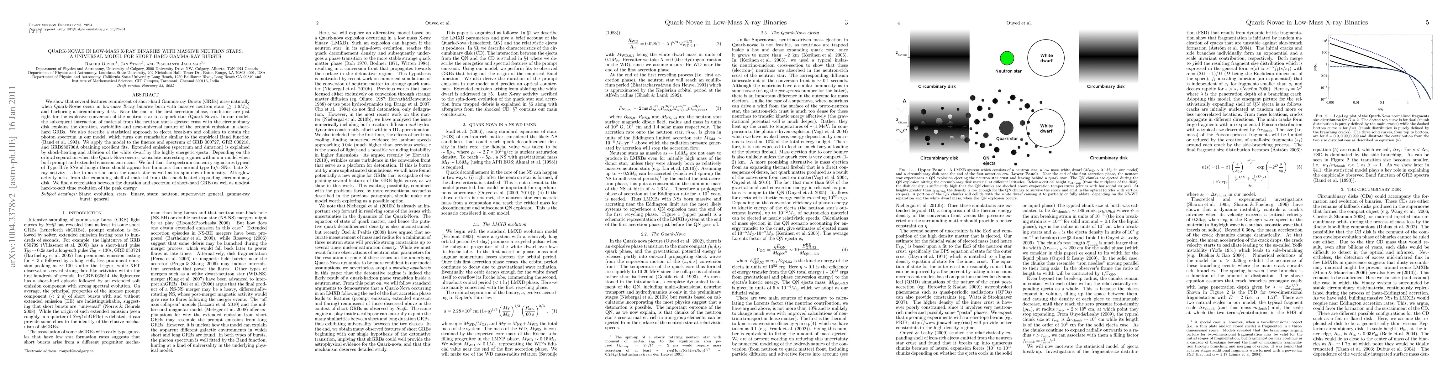 We show that several features reminiscent of short-hard Gamma-ray Bursts (GRBs) arise naturally when Quark-Novae occur in low-mass X-ray binaries born with massive neutron stars (> 1.6M_sun) and harboring a circumbinary disk. Near the end of the first accretion phase, conditions are just right for the explosive conversion of the neutron star to a quark star (Quark-Nova). In our model, the subsequent interaction of material from the neutron star's ejected crust with the circumbinary disk explains the duration, variability and near-universal nature of the prompt emission in short-hard GRBs. We also describe a statistical approach to ejecta break-up and collision to obtain the photon spectrum in our model, which turns out remarkably similar to the empirical Band function (Band 1993). We apply the model to the fluence and spectrum of GRB 000727, GRB 000218, and GRB980706A obtaining excellent fits. Extended emission (spectrum and duration) is explained by shock-heating and ablation of the white dwarf by the highly energetic ejecta. Depending on the orbital separation when the Quark-Nova occurs, we isolate interesting regimes within our model when both prompt and extended emission can occur. We find that the spectrum can carry signatures typical of Type Ib/c SNe although these should appear less luminous than normal type Ib/c SNe. Late X-ray activity is due to accretion onto the quark star as well as its spin-down luminosity. Afterglow activity arise from the expanding shell of material from the shock-heated expanding circumbinary disk. We find a correlation between the duration and spectrum of short-hard GRBs as well as modest hard-to-soft time evolution of the peak energy.