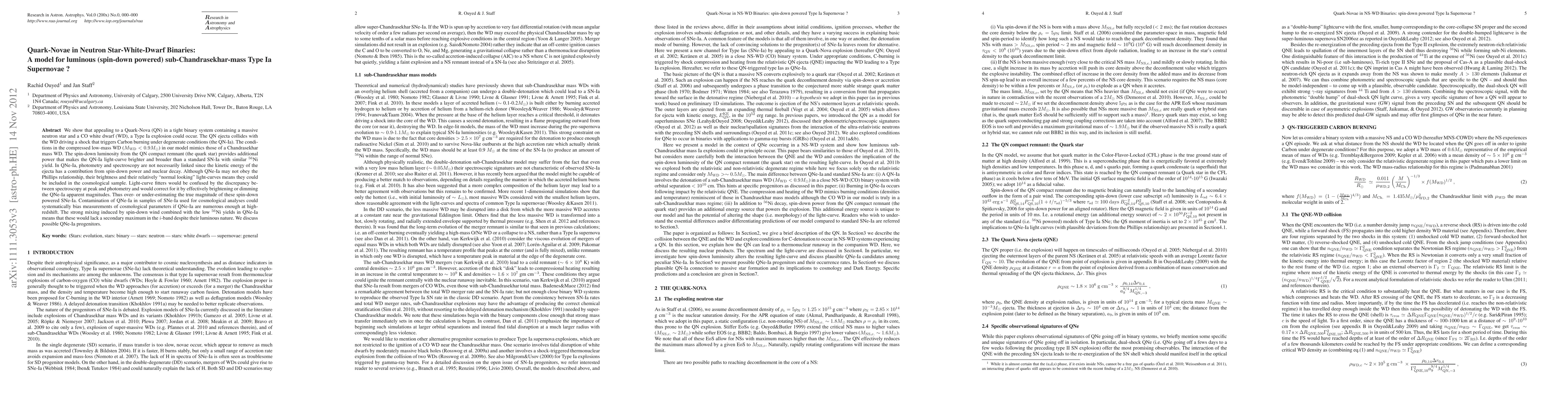 We show that appealing to a Quark-Nova (QN) in a tight binary system containing a massive neutron star and a CO white dwarf (WD), a Type Ia explosion could occur. The QN ejecta collides with the WD driving a shock that triggers Carbon burning under degenerate conditions (the QN-Ia). The conditions in the compressed low-mass WD (M_WD < 0.9M_sun) in our model mimics those of a Chandrasekhar mass WD. The spin-down luminosity from the QN compact remnant (the quark star) provides additional power that makes the QN-Ia light-curve brighter and broader than a standard SN-Ia with similar 56Ni yield. In QNe-Ia, photometry and spectroscopy are not necessarily linked since the kinetic energy of the ejecta has a contribution from spin-down power and nuclear decay. Although QNe-Ia may not obey the Phillips relationship, their brightness and their relatively "normal looking" light-curves means they could be included in the cosmological sample. Light-curve fitters would be confused by the discrepancy between spectroscopy at peak and photometry and would correct for it by effectively brightening or dimming the QNe-Ia apparent magnitudes. Thus over- or under-estimating the true magnitude of these spin-down powered SNe-Ia. Contamination of QNe-Ia in samples of SNe-Ia used for cosmological analyses could systematically bias measurements of cosmological parameters if QNe-Ia are numerous enough at high-redshift. The strong mixing induced by spin-down wind combined with the low 56Ni yields in QNe-Ia means that these would lack a secondary maximum in the i-band despite their luminous nature. We discuss possible QNe-Ia progenitors.