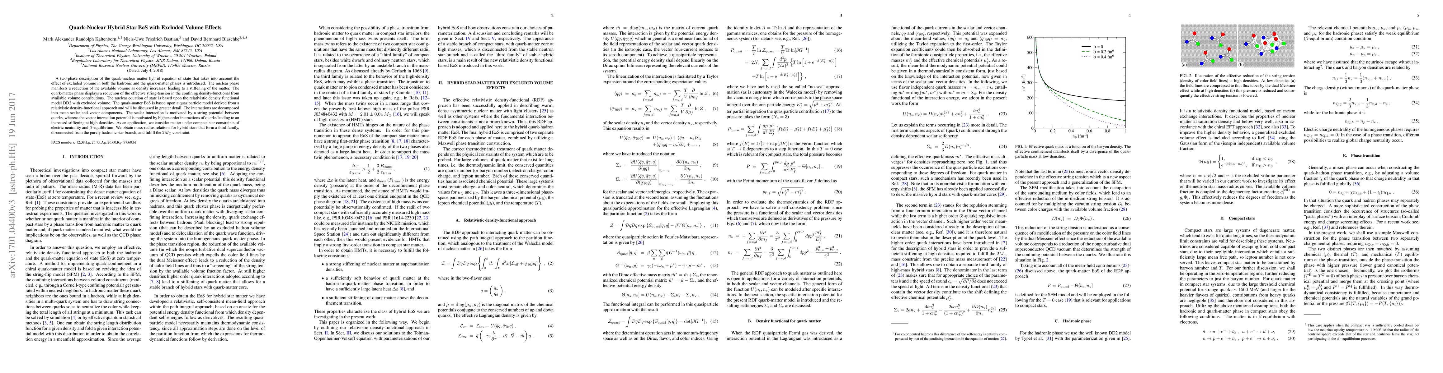 This paper introduces a hybrid equation of state for quark-nuclear matter that considers excluded volume effects in both phases. It finds a stiffened nuclear phase due to reduced volume and a modified quark phase with reduced string tension, leading to mass-radius relations for hybrid stars that meet the $2M_\odot$ constraint.