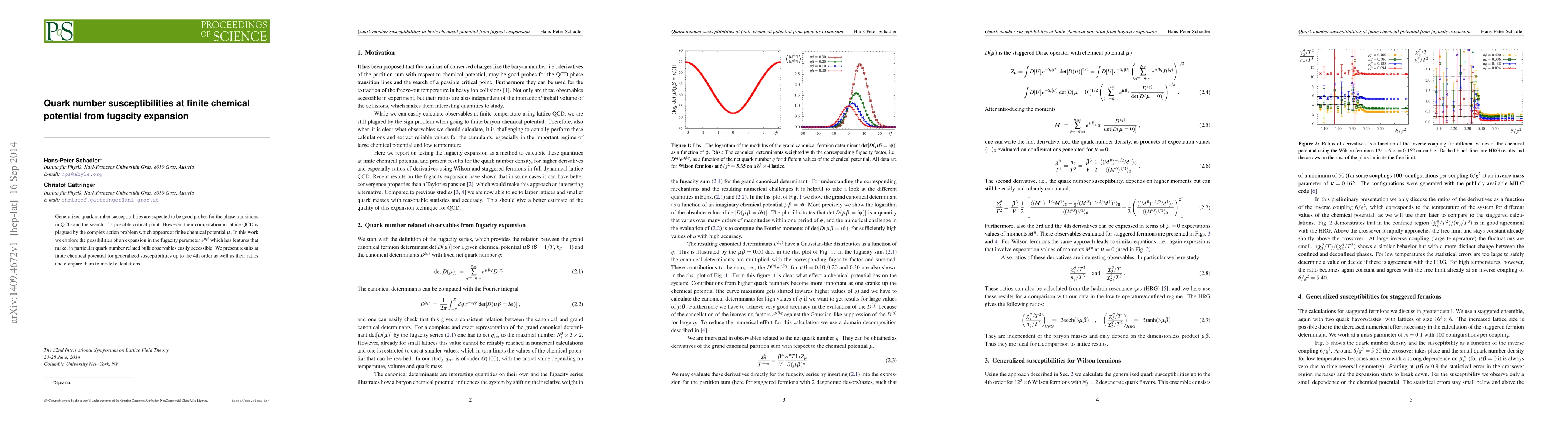 Generalized quark number susceptibilities are expected to be good probes for the phase transitions in QCD and the search of a possible critical point. However, their computation in lattice QCD is plagued by the complex action problem which appears at finite chemical potential mu. In this work we explore the possibilities of an expansion in the fugacity parameter exp(mu beta) which has features that make, in particular quark number related bulk observables easily accessible. We present results at finite chemical potential for generalized susceptibilities up to the 4th order as well as their ratios and compare them to model calculations.