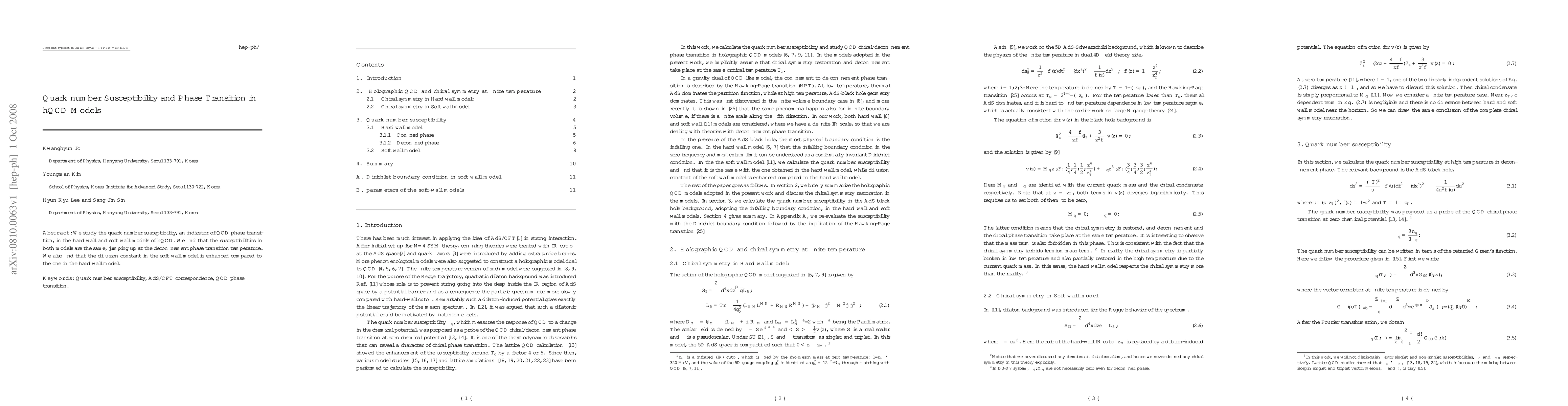 The research compares quark number susceptibility in hard wall and soft wall models of holographic QCD (hQCD). Both models show identical susceptibility jumps at the deconfinement phase transition temperature, indicating a shared phase transition behavior. The study also reveals that the soft wall model has a higher diffusion constant than the hard wall model.
