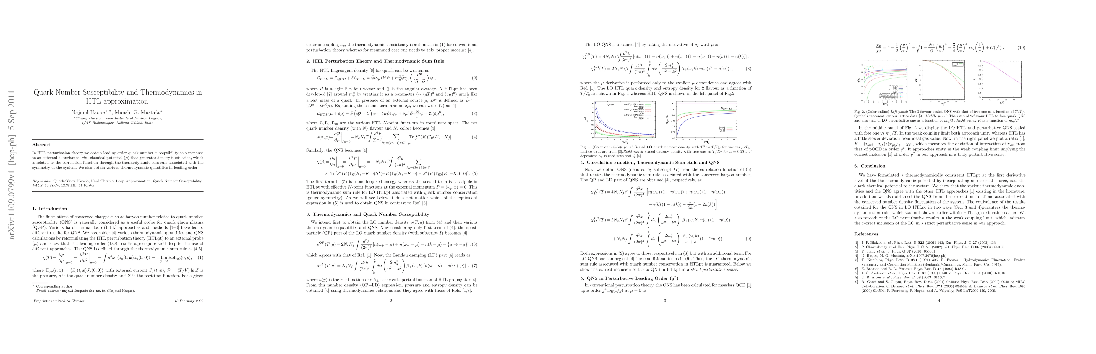 Researchers used HTL perturbation theory to study quark number susceptibility and thermodynamics in a system, finding correlations with external disturbances like chemical potential. They obtained leading order results for thermodynamic quantities related to symmetry.