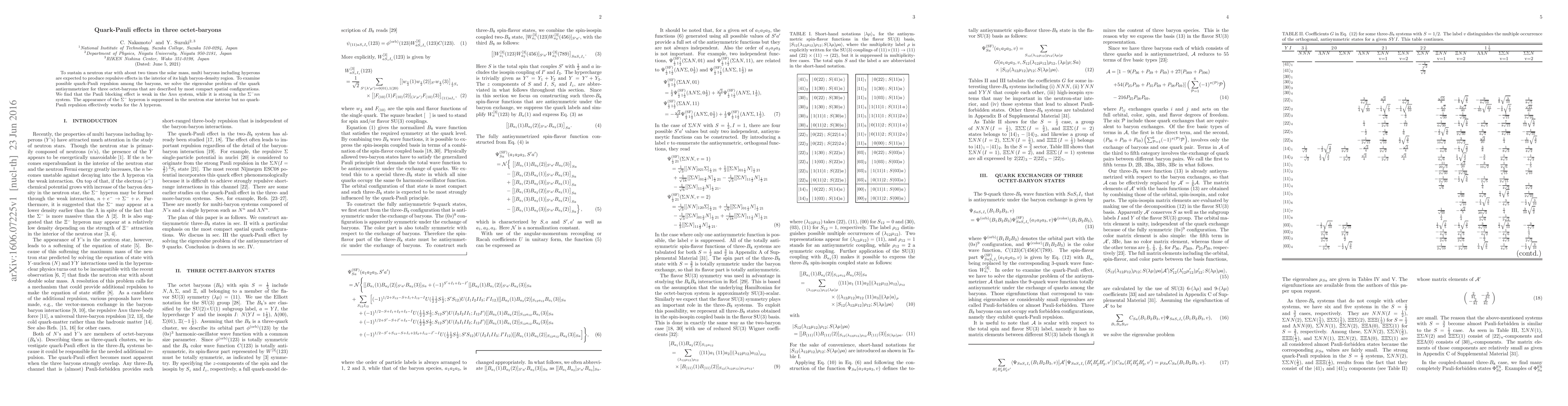 The study examines quark-Pauli effects in three octet-baryons by solving the eigenvalue problem of the quark antisymmetrizer for compact spatial configurations, focusing on systems like $\Lambda nn$, $\Sigma^-nn$, and others.