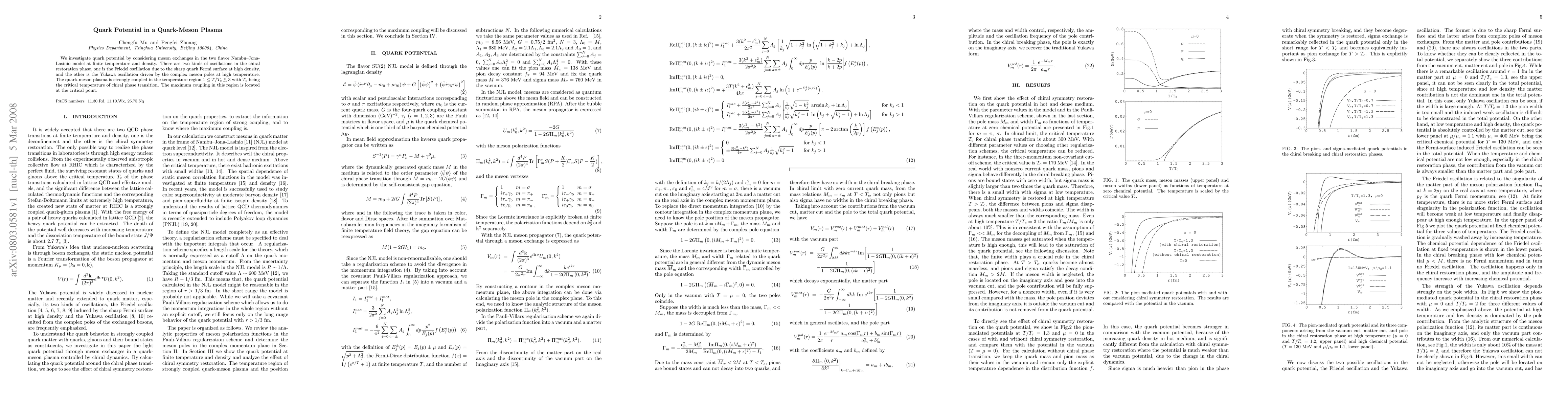 Researchers investigate quark potential in a quark-meson plasma at finite temperature and density, finding two types of oscillations: Friedel and Yukawa oscillations, driven by the Fermi surface and meson poles, respectively.