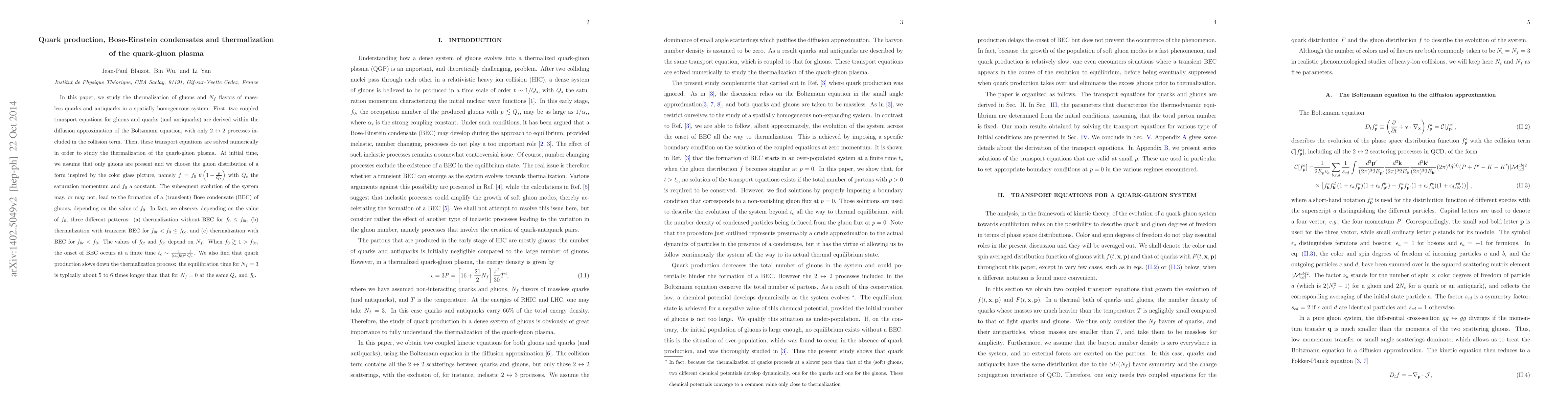 In this paper, we study the thermalization of gluons and N_f flavors of massless quarks and antiquarks in a spatially homogeneous system. First, two coupled transport equations for gluons and quarks (and antiquarks) are derived within the diffusion approximation of the Boltzmann equation, with only 2<-> 2 processes included in the collision term. Then, these transport equations are solved numerically in order to study the thermalization of the quark-gluon plasma. At initial time, we assume that no quarks or antiquarks are present and we choose the gluon distribution in the form f = f_0 theta (1-p/Q_s) with Q_s the saturation momentum and f_0 a constant. The subsequent evolution of systems may, or may not, lead to the formation of a (transient) Bose condensate, depending on the value of f_0. In fact, we observe, depending on the value of f_0, three different patterns: (a) thermalization without gluon Bose-Einstein condensate (BEC) for f_0 < f_{0t}, (b) thermalization with transient BEC for f_{0t} < f_0 < f_{0c}, and (c) thermalization with BEC for f_{0c} < f_0. The values of f_{0t} and f_{0c} depend on N_f. When f_0> 1 > f_{0c}, the onset of BEC occurs at a finite time t_c ~ 1/((alpha_s f_0)^2 Q_s). We also find that quark production slows down the thermalization process: the equilibration time for N_f = 3 is typically about 5 to 6 times longer than that for N_f = 0 at the same Q_s.