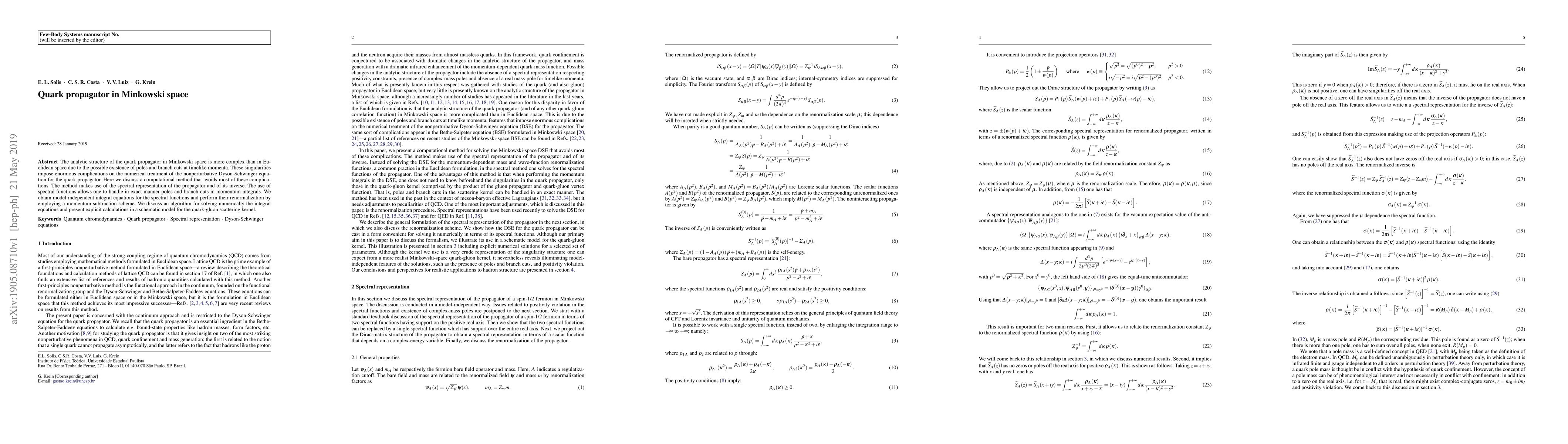 This paper proposes a computational method for analyzing the quark propagator in Minkowski space, addressing the complexities introduced by singularities at timelike momenta. The method leverages the spectral representation and renormalization techniques to handle poles and branch cuts, providing a model-independent approach to solving the nonperturbative Dyson-Schwinger equation.