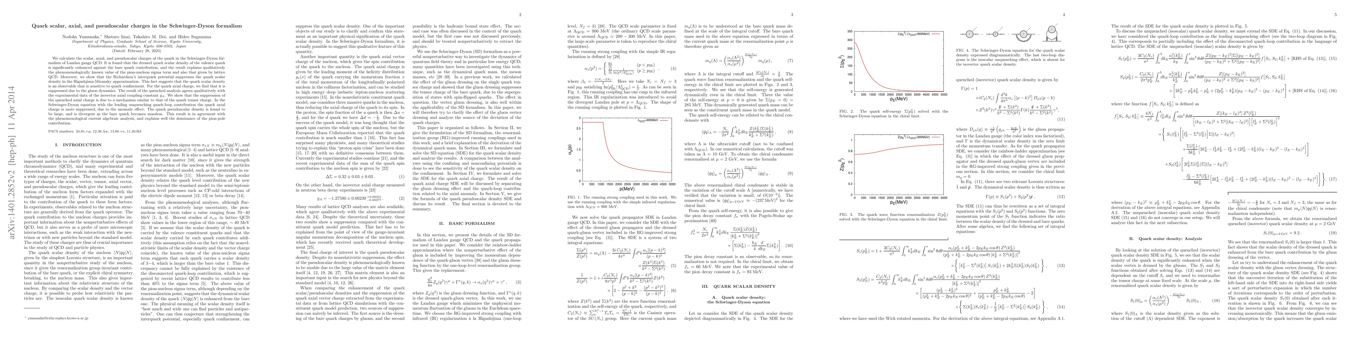 We calculate the scalar, axial, and pseudoscalar charges of the quark in the Schwinger-Dyson formalism of Landau gauge QCD. It is found that the dressed quark scalar density of the valence quark is significantly enhanced against the bare quark contribution, and the result explains qualitatively the phenomenologically known value of the pion-nucleon sigma term and also that given by lattice QCD. Moreover, we show that the Richardson's interquark potential suppresses the quark scalar density in the Higashjima-Miransky approximation. This fact suggests that the quark scalar density is an observable that is sensitive to quark confinement. For the quark axial charge, we find that it is suppressed due to the gluon dynamics. The result of the quenched analysis agrees qualitatively with the experimental data of the isovector axial coupling constant $g_A$. We show that the suppression of the quenched axial charge is due to a mechanism similar to that of the quark tensor charge. In the Schwinger-Dyson equation with the leading unquenching quark-loop contribution the quark axial charge is more suppressed, due to the anomaly effect. The quark pseudoscalar density is found to be large, and is divergent as the bare quark becomes massless. This result is in agreement with the phenomenological current algebraic analysis, and explains well the dominance of the pion-pole contribution.