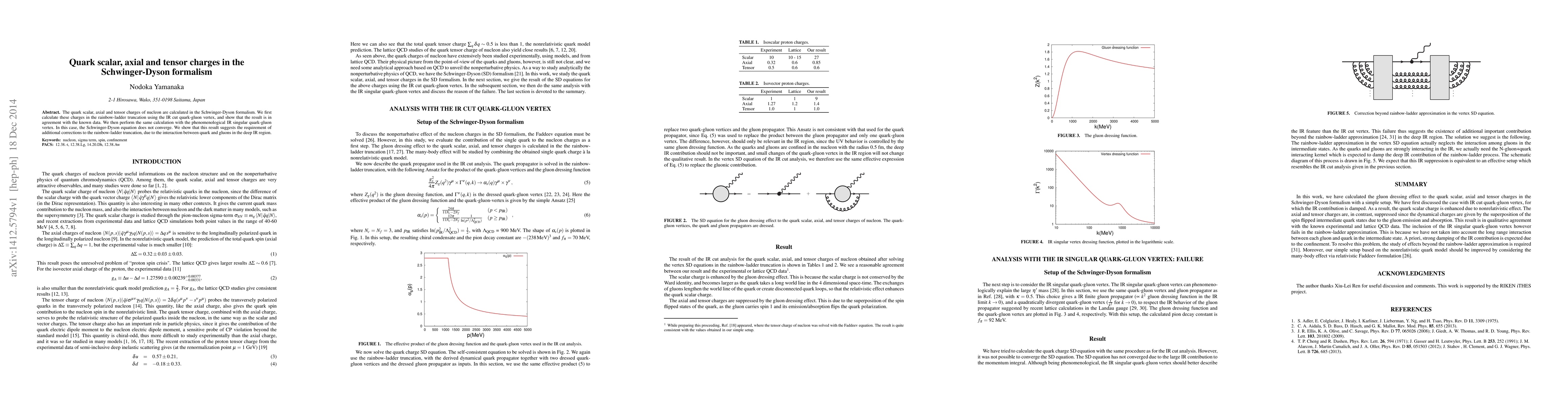 This paper calculates quark scalar, axial, and tensor charges in nucleons using the Schwinger-Dyson formalism, finding agreement with known data in the rainbow-ladder truncation but requiring additional corrections due to non-convergence with a phenomenological IR singular quark-gluon vertex.
