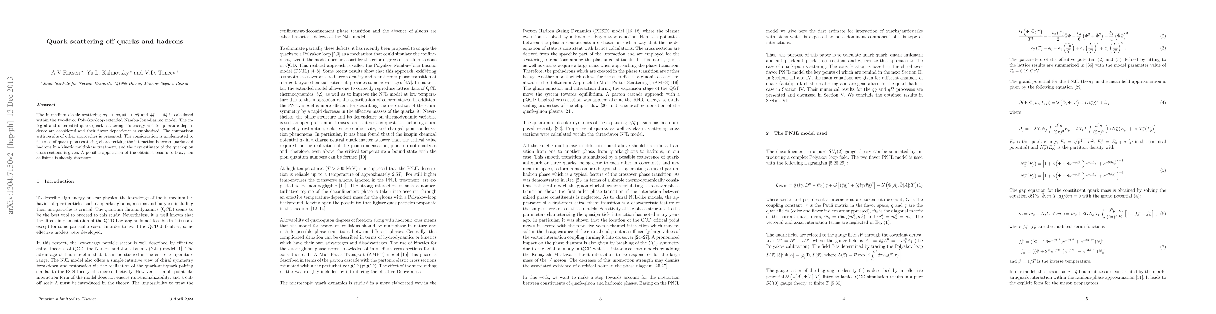 The in-medium elastic scattering $qq\to qq, q\bar{q}\to q\bar{q}$ and $\bar{q}\bar{q}\to \bar{q}\bar{q}$ is calculated within the two-flavor Polyakov-loop-extended Nambu-Jona-Lasinio model. The integral and differential quark-quark scattering, its energy and temperature dependence are considered and their flavor dependence is emphasized. The comparison with results of other approaches is presented. The consideration is implemented to the case of quark-pion scattering characterizing the interaction between quarks and hadrons in a kinetic multiphase treatment, and the first estimate of the quark-pion cross sections is given. A possible application of the obtained results to heavy ion collisions is shortly discussed.