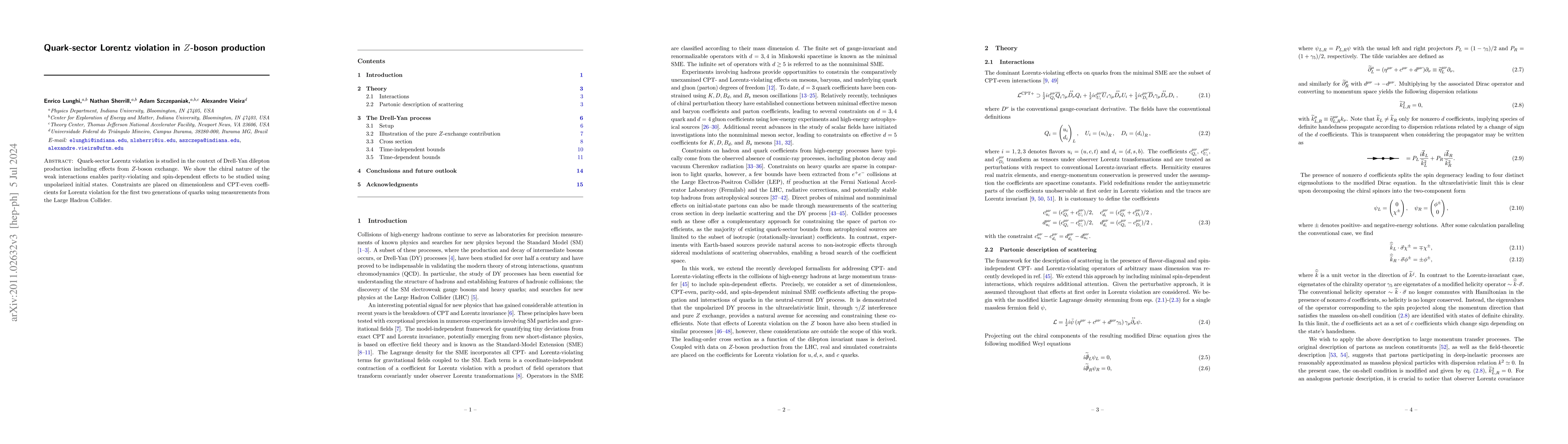 This paper investigates quark-sector Lorentz violation in Z-boson mediated Drell-Yan dilepton production, demonstrating how the chiral nature of weak interactions allows for parity-violating and spin-dependent effects to be studied with unpolarized initial states. Constraints on CPT-even coefficients for Lorentz violation in the first two quark generations are derived from Large Hadron Collider measurements.