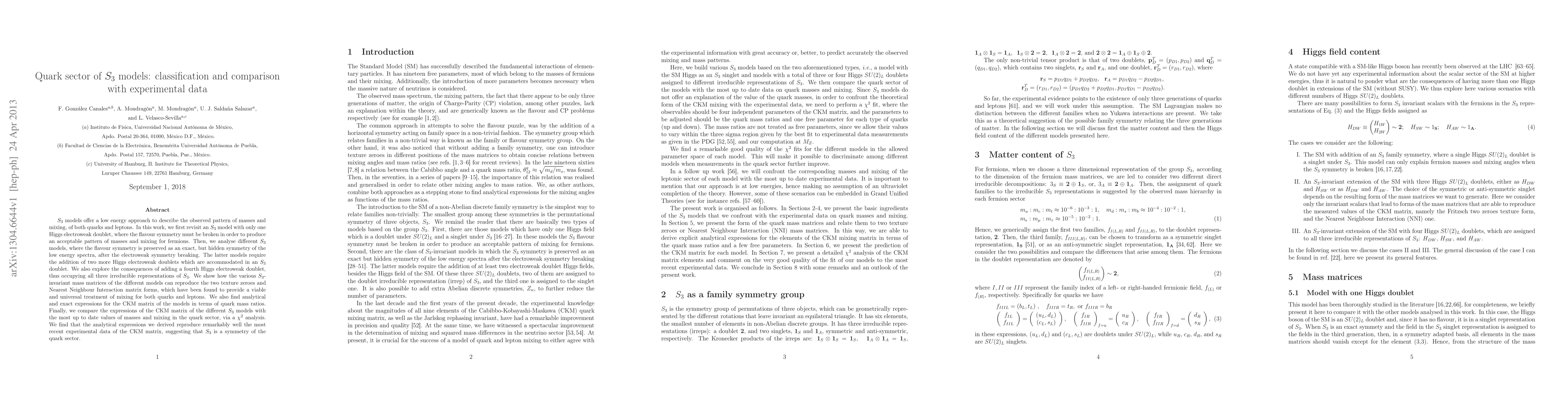 The paper presents a detailed classification and comparison of S3 models with varying numbers of Higgs doublets, providing exact analytical expressions for the CKM matrix elements in terms of quark mass ratios and a shift parameter.