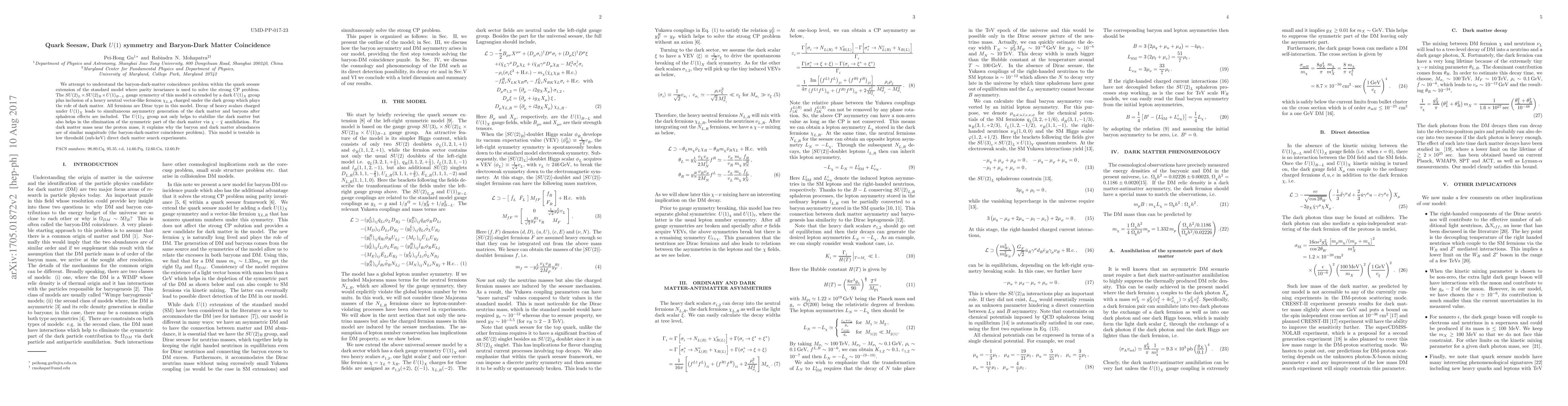 We attempt to understand the baryon-dark-matter coincidence problem within the quark seesaw extension of the standard model where parity invariance is used to solve the strong CP problem. The $SU(2)_L\times SU(2)_R\times U(1)_{B-L}$ gauge symmetry of this model is extended by a dark $U(1)_X$ group plus inclusion of a heavy neutral vector-like fermion $\chi_{L,R}$ charged under the dark group which plays the role of dark matter. All fermions are Dirac type in this model. Decay of heavy scalars charged under $U(1)_X$ leads to simultaneous asymmetry generation of the dark matter and baryons after sphaleron effects are included. The $U(1)_X$ group not only helps to stabilize the dark matter but also helps in the elimination of the symmetric part of the dark matter via $\chi-\bar{\chi}$ annihilation. For dark matter mass near the proton mass, it explains why the baryon and dark matter abundances are of similar magnitude (the baryon-dark-matter coincidence problem). This model is testable in low threshold (sub-keV) direct dark matter search experiments.