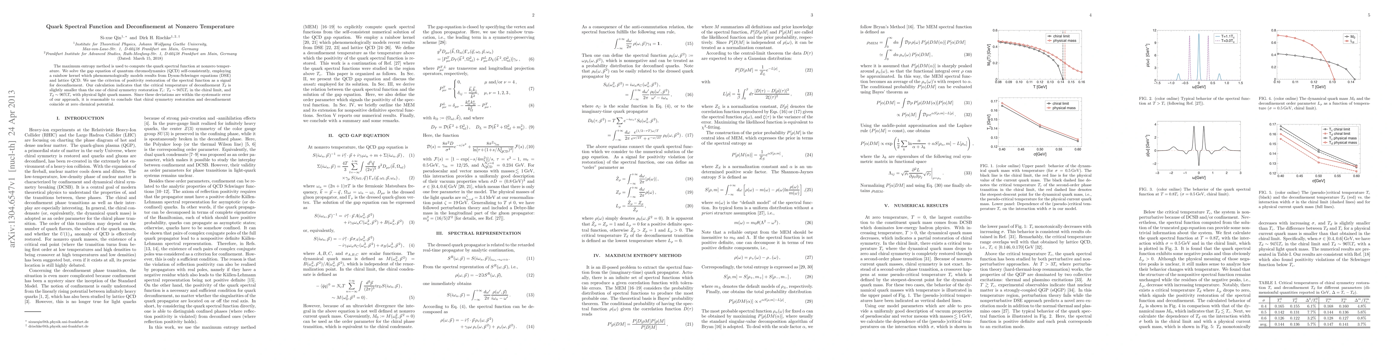 The maximum entropy method is used to compute the quark spectral function at nonzero temperature. We solve the gap equation of quantum chromodynamics (QCD) self-consistently, employing a rainbow kernel which phenomenologically models results from Dyson-Schwinger equations (DSE) and lattice QCD. We use the criterion of positivity restoration of the spectral function as a signal for deconfinement. Our calculation indicates that the critical temperature of deconfinement $T_d$ is slightly smaller than the one of chiral symmetry restoration $T_c$: $T_d\sim 94% T_c$ in the chiral limit, and $T_d\sim 96% T_c$ with physical light quark masses. Since these deviations are within the systematic error of our approach, it is reasonable to conclude that chiral symmetry restoration and deconfinement coincide at zero chemical potential.