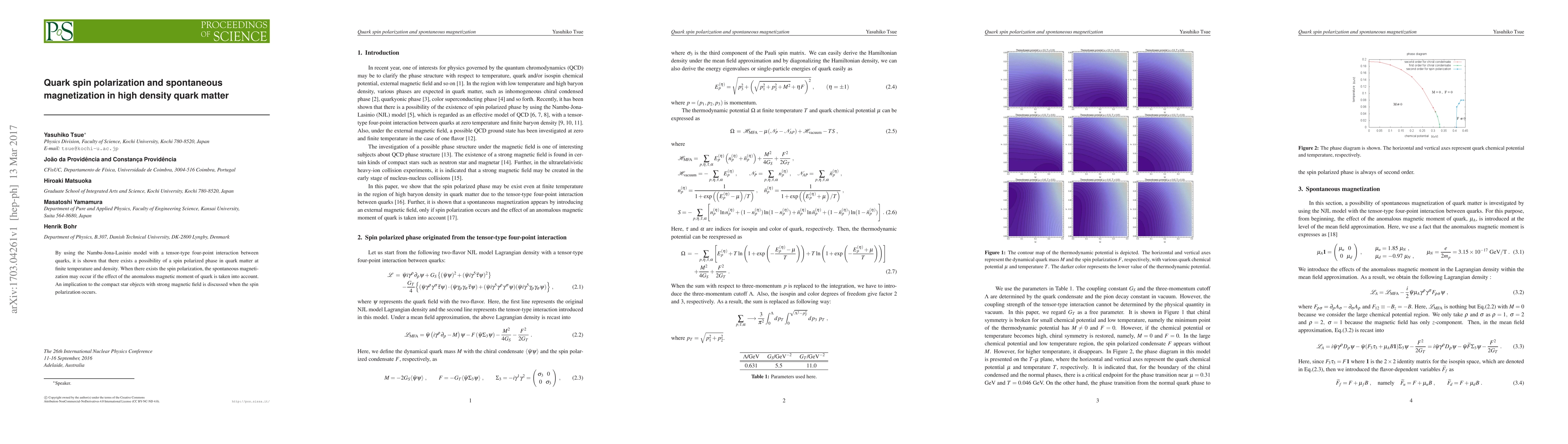 Summary: The Nambu-Jona-Lasinio model reveals a potential spin polarized phase in high-density quark matter at finite temperature and density, with spontaneous magnetization arising from quark anomalous magnetic moments. Implications for magnetized compact stars are discussed.