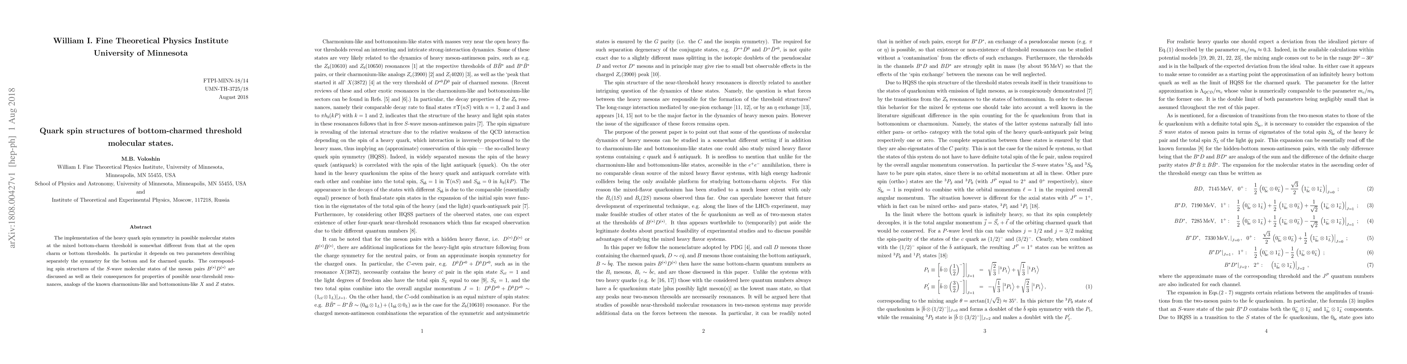The implementation of the heavy quark spin symmetry in possible molecular states at the mixed bottom-charm threshold is somewhat different from that at the open charm or bottom thresholds. In particular it depends on two parameters describing separately the symmetry for the bottom and for charmed quarks. The corresponding spin structures of the $S$-wave molecular states of the meson pairs $B^{(*)} D^{(*)}$ are discussed as well as their consequences for properties of possible near-threshold resonances, analogs of the known charmonium-like and bottomonium-like $X$ and $Z$ states.