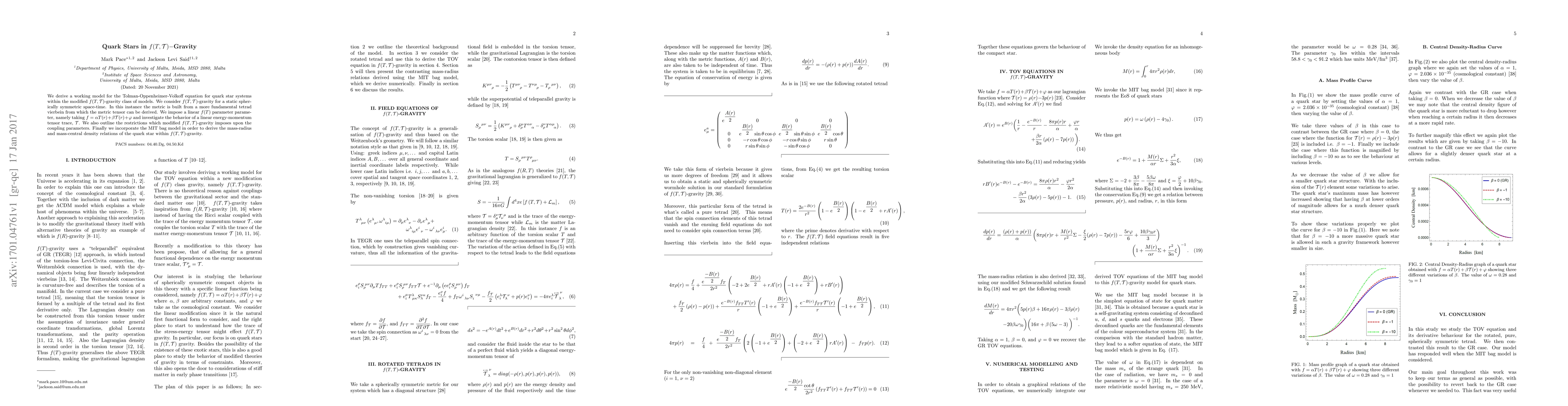 We derive a working model for the Tolman-Oppenheimer-Volkoff equation for quark star systems within the modified $f(T, \mathcal{T})$-gravity class of models. We consider $f(T, \mathcal{T})$-gravity for a static spherically symmetric space-time. In this instance the metric is built from a more fundamental tetrad vierbein from which the metric tensor can be derived. We impose a linear $f(T)$ parameter parameter, namely taking $f=\alpha T(r) + \beta \mathcal{T}(r) + \varphi$ and investigate the behavior of a linear energy-momentum tensor trace, $\mathcal{T}$. We also outline the restrictions which modified $f(T, \mathcal{T})$-gravity imposes upon the coupling parameters. Finally we incorporate the MIT bag model in order to derive the mass-radius and mass-central density relations of the quark star within $f(T, \mathcal{T})$-gravity.