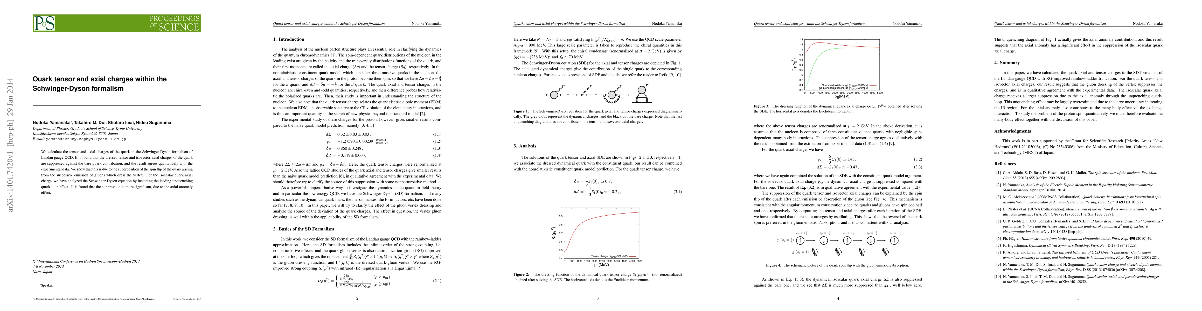 This paper calculates quark tensor and axial charges within the Schwinger-Dyson formalism of Landau gauge QCD, finding that dressed charges are suppressed compared to bare quark contributions, aligning qualitatively with experimental data. The suppression is attributed to gluon-induced spin flips and the axial anomaly effect, particularly for isoscalar charges.