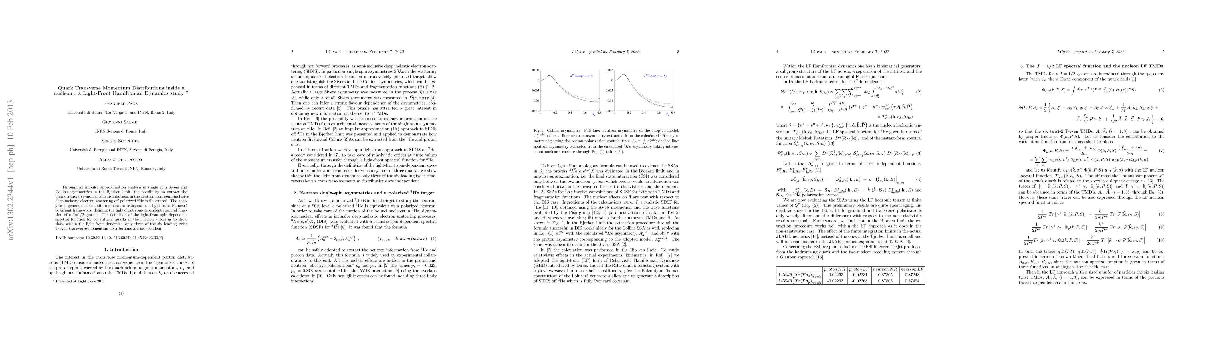 Through an impulse approximation analysis of single spin Sivers and Collins asymmetries in the Bjorken limit, the possibility to extract the quark transverse-momentum distributions in the neutron from semi-inclusive deep inelastic electron scattering off polarized 3He is illustrated. The analysis is generalized to finite momentum transfers in a light-front Poincare' covariant framework, defining the light-front spin-dependent spectral function of a J=1/2 system. The definition of the light-front spin-dependent spectral function for constituent quarks in the nucleon allows us to show that, within the light-front dynamics, only three of the six leading twist T-even transverse-momentum distributions are independent.