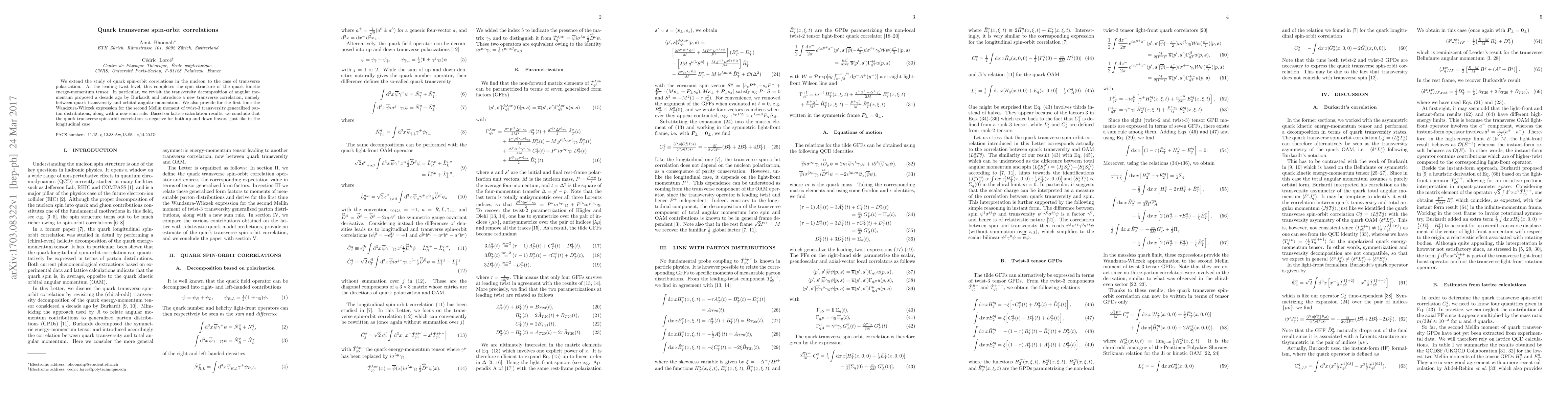 We extend the study of quark spin-orbit correlations in the nucleon to the case of transverse polarization. At the leading-twist level, this completes the spin structure of the quark kinetic energy-momentum tensor. In particular, we revisit the transversity decomposition of angular momentum proposed a decade ago by Burkardt and introduce a new transverse correlation, namely between quark transversity and orbital angular momentum. We also provide for the first time the Wandzura-Wilczek expression for the second Mellin moment of twist-3 transversity generalized parton distributions, along with a new sum rule. Based on lattice calculation results, we conclude that the quark transverse spin-orbit correlation is negative for both up and down flavors, just like in the longitudinal case.