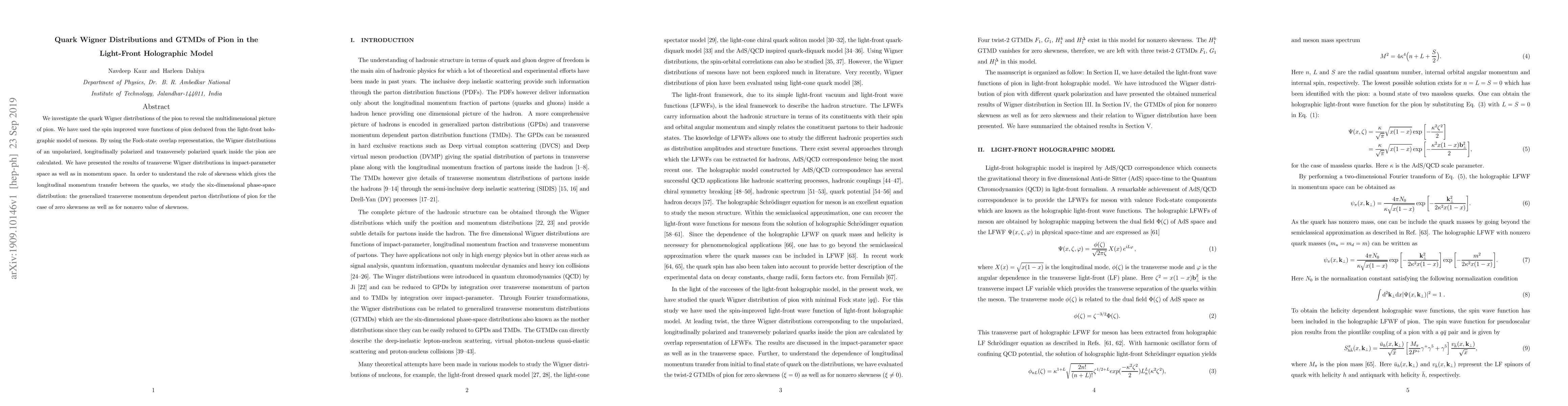 This paper explores quark Wigner distributions and generalized transverse momentum dependent parton distributions of the pion using the light-front holographic model. It calculates the Wigner distributions for unpolarized, longitudinally, and transversely polarized quarks, and examines the role of skewness in the six-dimensional phase-space distribution.