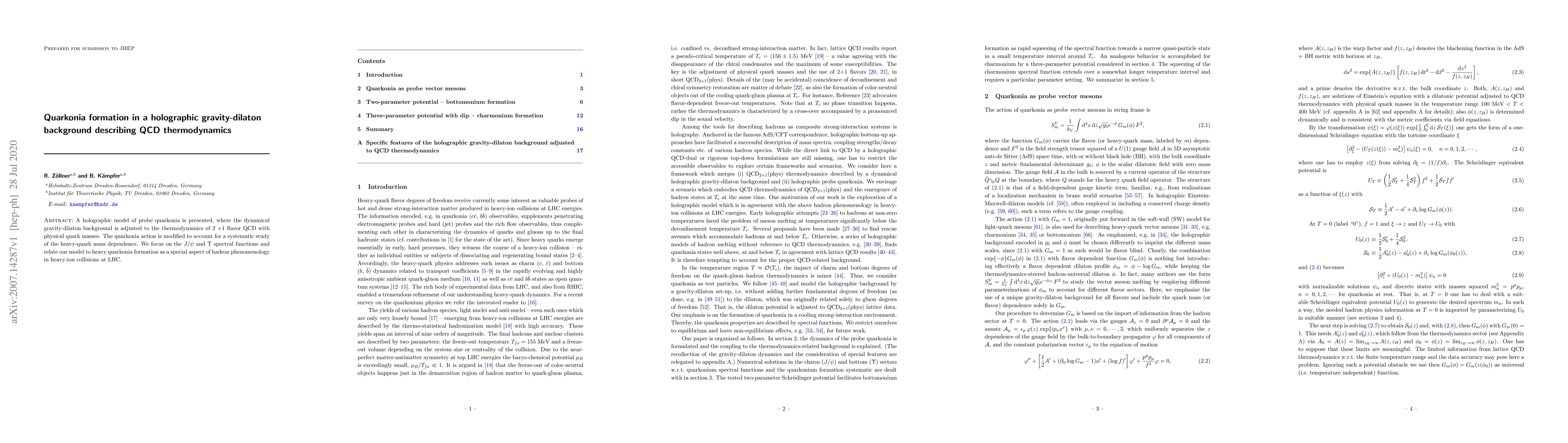 A holographic model of probe quarkonia is presented, where the dynamical gravity-dilaton background is adjusted to the thermodynamics of 2 +1 flavor QCD with physical quark masses. The quarkonia action is modified to account for a systematic study of the heavy-quark mass dependence. We focus on the $J/\psi$ and $\Upsilon$ spectral functions and relate our model to heavy quarkonia formation as a special aspect of hadron phenomenology in heavy-ion collisions at LHC.
