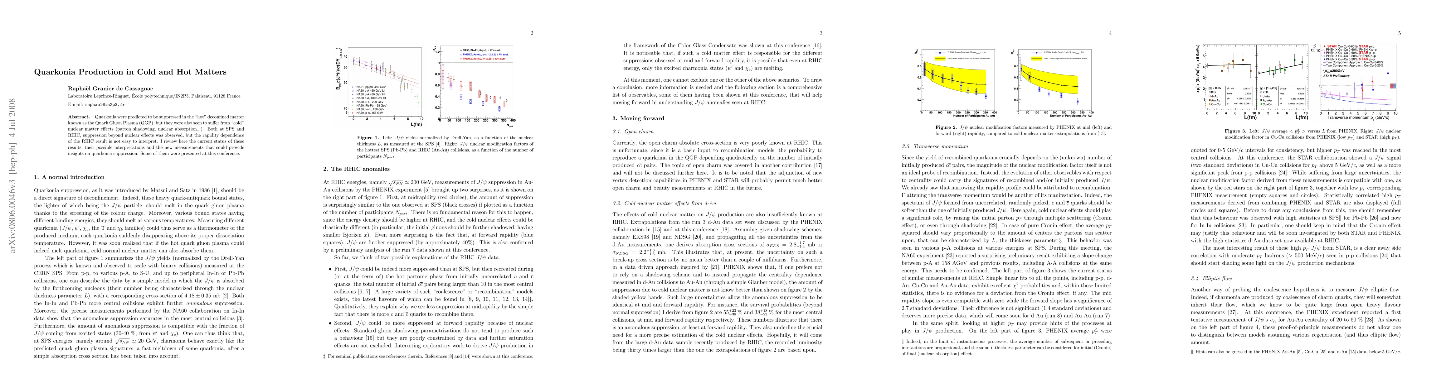 This paper reviews quarkonia suppression in both hot Quark Gluon Plasma and cold nuclear matter, highlighting observed suppression beyond nuclear effects and discussing the complexities in interpreting the rapidity dependence of RHIC results. It also outlines new measurements that may clarify these phenomena.