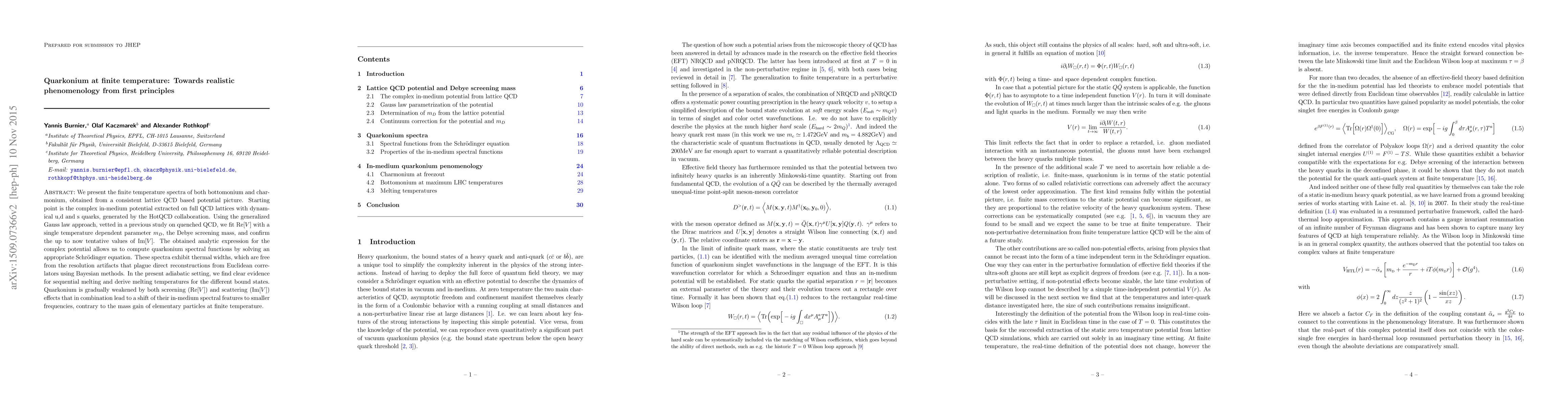 This paper calculates the spectra of quarkonium at finite temperature using a lattice QCD model, finding that thermal widths and in-medium effects lead to sequential melting and a shift of spectral features to smaller frequencies.