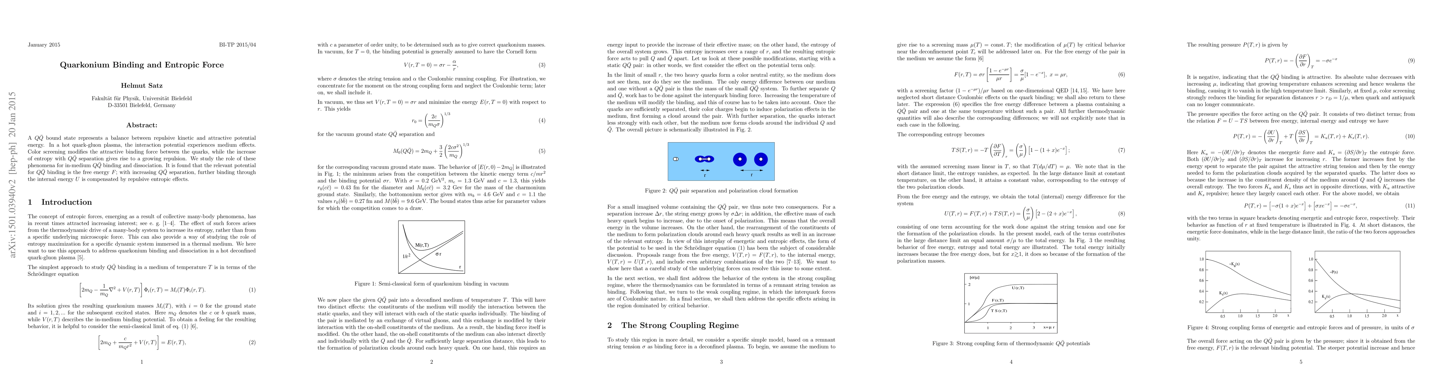 The research explores quarkonium binding and entropic force in a hot quark-gluon plasma. It finds that while color screening weakens the attractive binding force, entropy increase with Q-Qbar separation creates repulsion. The free energy F is identified as the relevant potential for Q-Qbar binding, balancing internal energy U and entropic repulsion with increasing separation.