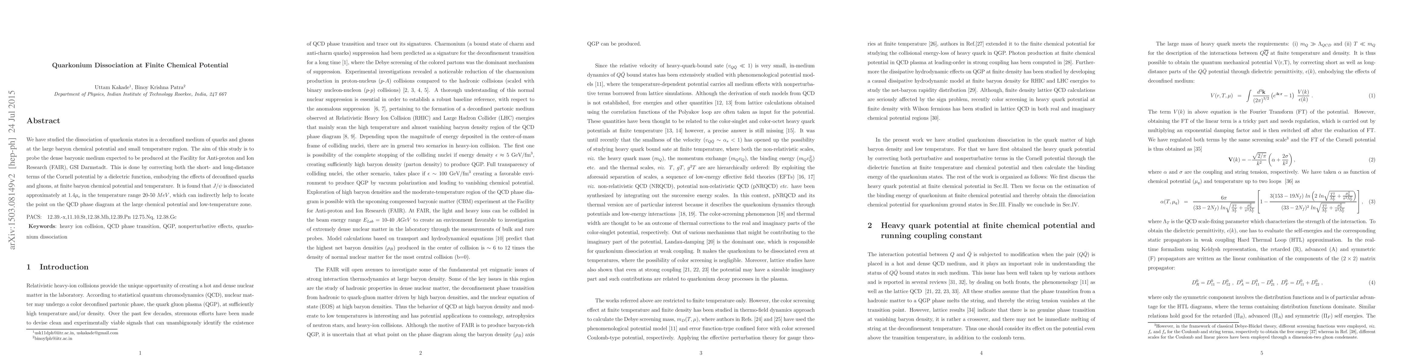 Researchers studied quarkonium dissociation in a dense baryonic medium at high chemical potential and low temperature, finding that the J/psi state is broken apart around 1.4mu_c within this range.