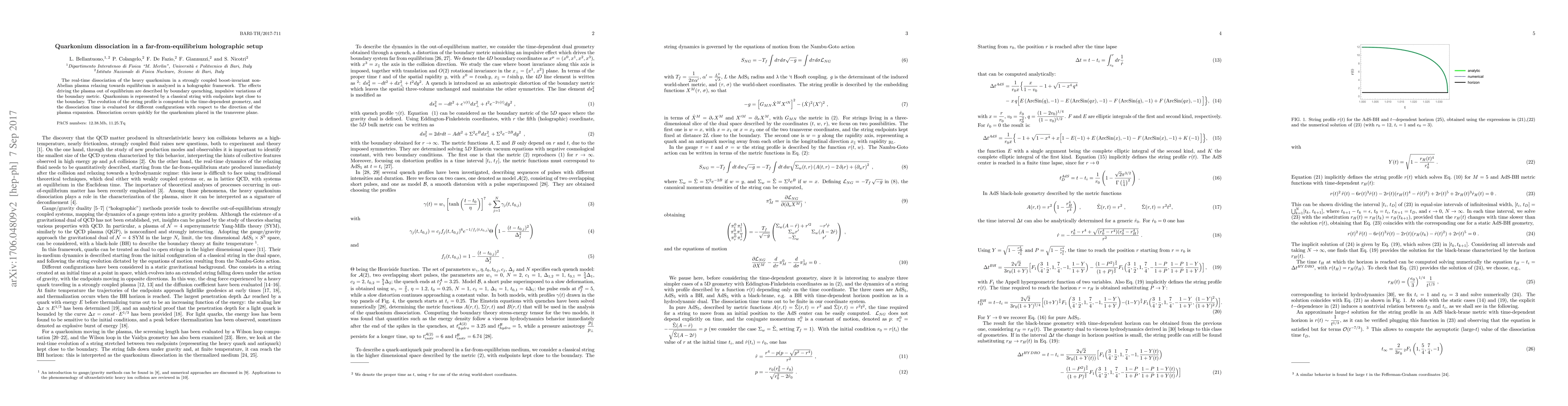 The paper presents analytical expressions for the time taken to reach a specific position in AdS and AdS black hole geometries, as well as the computation of quarkonium dissociation times for various configurations in a far-from-equilibrium holographic setup.