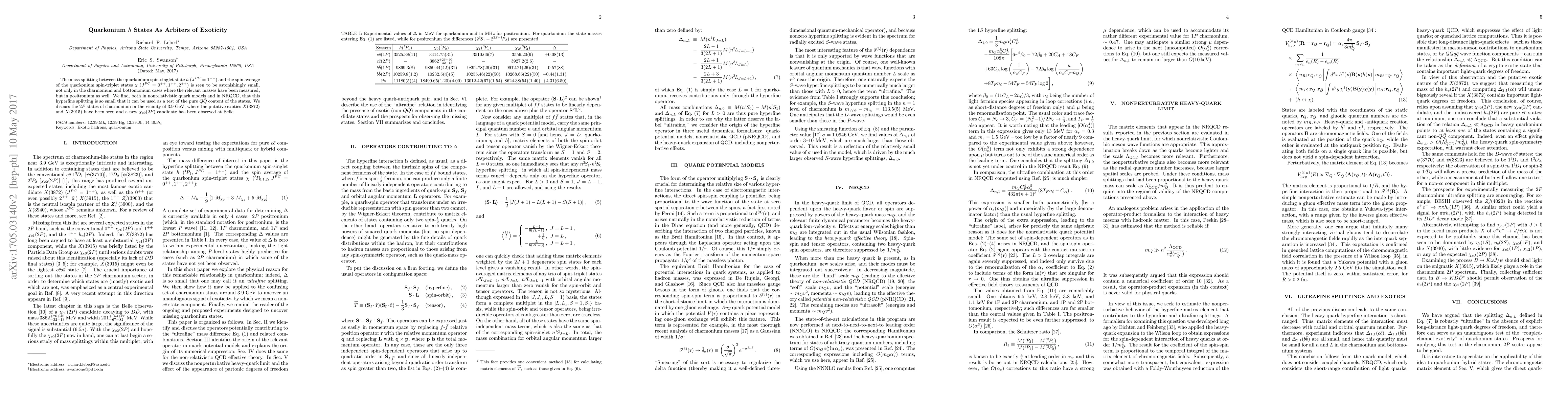 The mass splitting between the quarkonium spin-singlet state $h$ ($J^{PC} = 1^{+-}$) and the spin average of the quarkonium spin-triplet states $\chi$ ($J^{PC} = 0^{++}, 1^{++}, 2^{++}$) is seen to be astonishingly small, not only in the charmonium and bottomonium cases where the relevant masses have been measured, but in positronium as well. We find, both in nonrelativistic quark models and in NRQCD, that this hyperfine splitting is so small that it can be used as a test of the pure $Q\bar Q$ content of the states. We discuss the $2P$ states of charmonium in the vicinity of $3.9$ GeV, where the putative exotics $X(3872)$ and $X(3915)$ have been seen and a new $\chi_{c0}(2P)$ candidate has been observed at Belle.