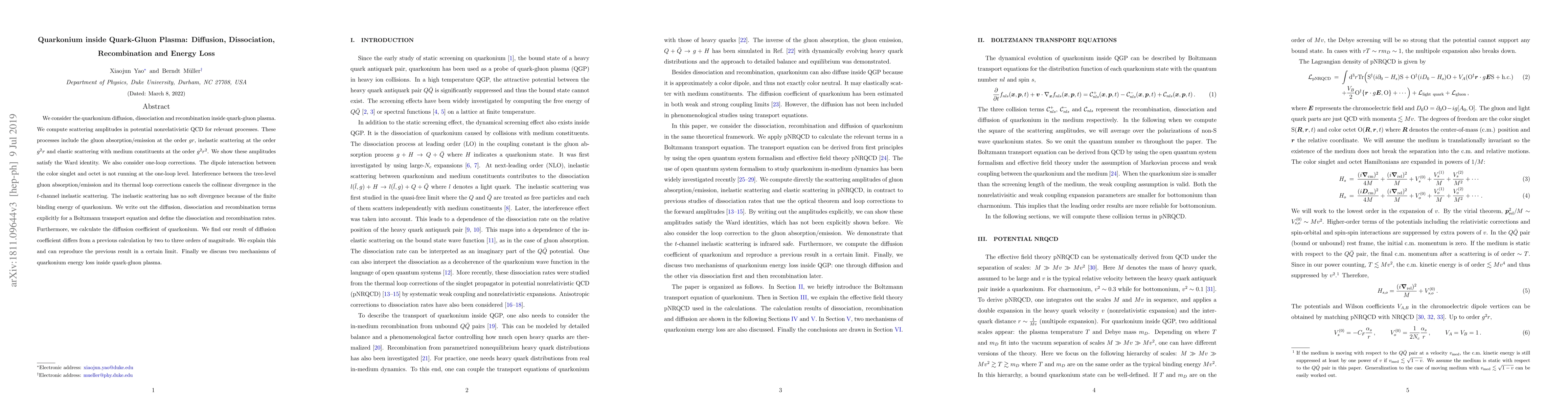 This paper investigates quarkonium dynamics within quark-gluon plasma, detailing diffusion, dissociation, and recombination processes. It computes scattering amplitudes and finds significant differences in the calculated diffusion coefficient compared to previous studies, explaining the discrepancy and discussing energy loss mechanisms.