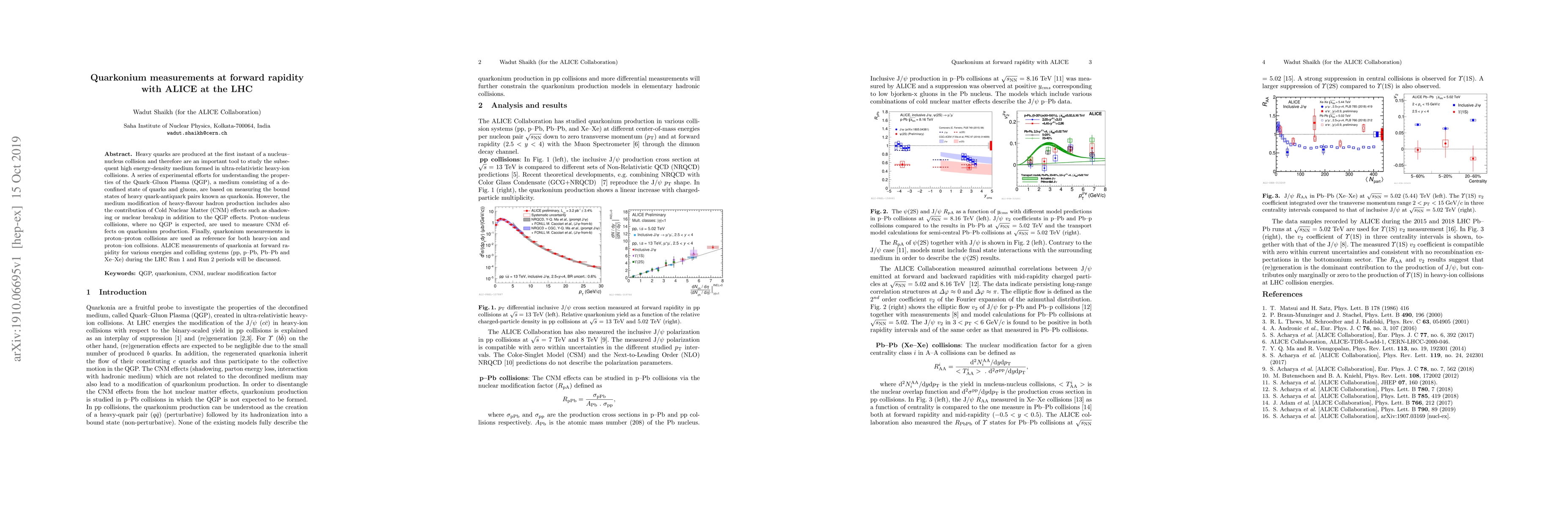 This paper discusses ALICE's measurements of quarkonia at forward rapidity in various collision systems (pp, p-Pb, Pb-Pb, and Xe-Xe) to study the Quark-Gluon Plasma and Cold Nuclear Matter effects during LHC Run 1 and Run 2. The results help understand the medium modifications and production of heavy-flavor hadrons.
