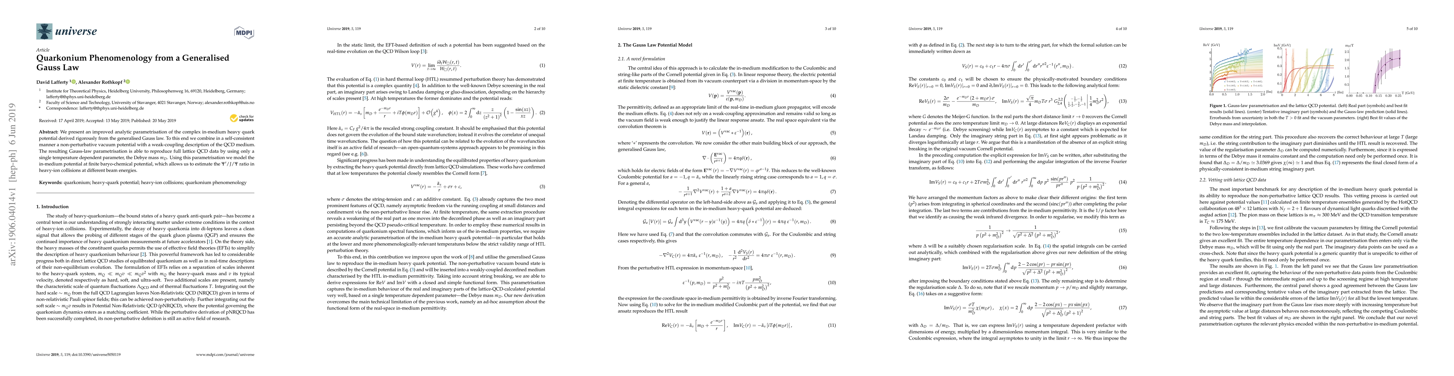 This paper develops an improved analytic parametrisation of the in-medium heavy quark potential based on the generalised Gauss law, combining non-perturbative vacuum potentials with weak-coupling QCD medium descriptions. The parametrisation, dependent on a single temperature parameter, accurately reproduces lattice QCD data and estimates the $\Psi^\prime$/$J/\Psi$ ratio in heavy-ion collisions.