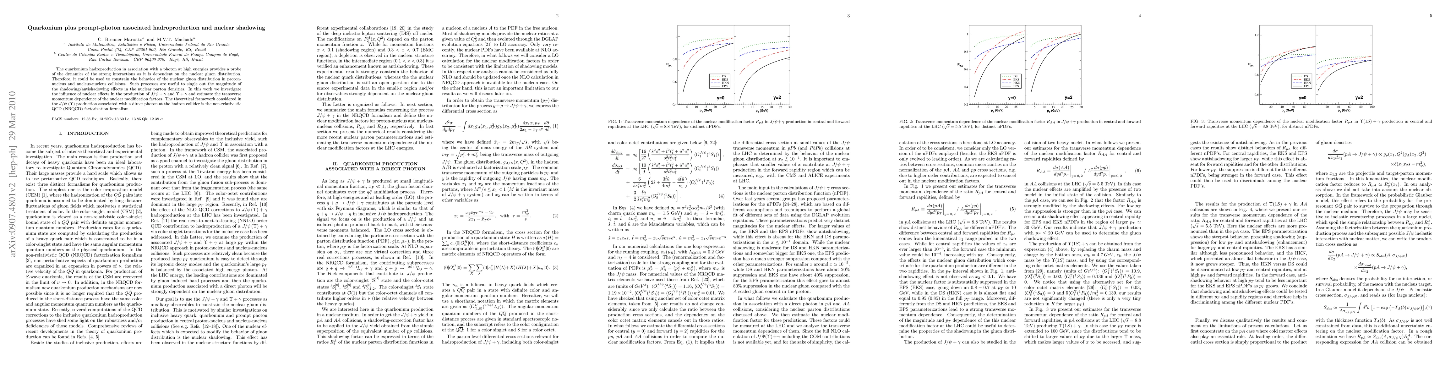 This paper investigates the production of quarkonium (JPsi and Upsilon) in association with a prompt photon at high energies, using non-relativistic QCD to probe nuclear gluon distributions and nuclear shadowing effects in proton-nucleus and nucleus-nucleus collisions. It estimates the transverse momentum dependence of nuclear modification factors to quantify shadowing/antishadowing in nuclear parton densities.