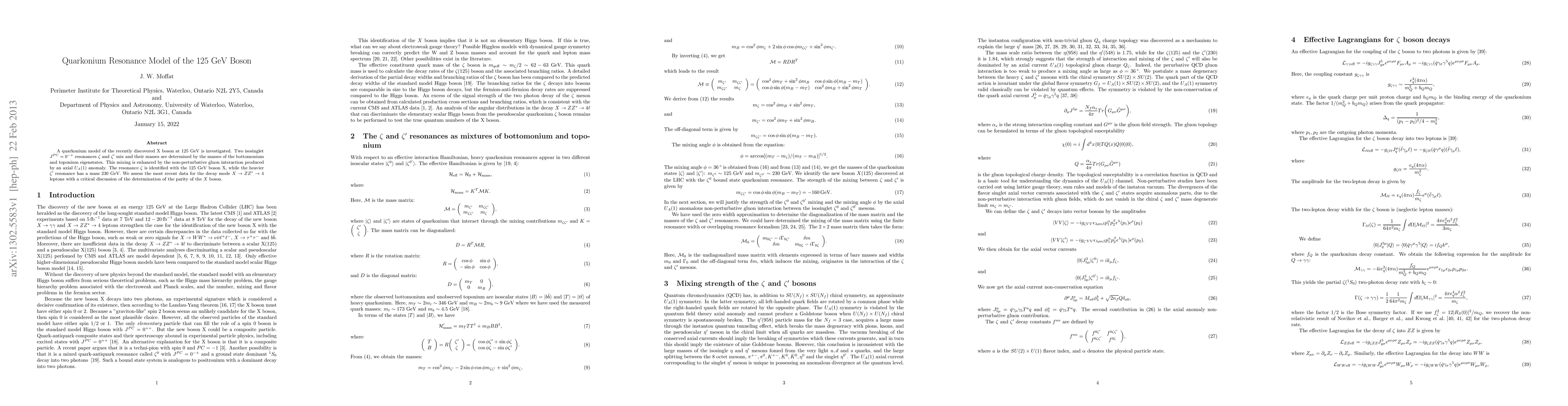 A quarkonium model of the recently discovered X boson at 125 GeV is investigated. Two isosinglet $J^{PC}=0^{-+}$ resonances $\zeta$ and $\zeta'$ mix and their masses are determined by the masses of the bottomonium and toponium eigenstates. This mixing is enhanced by the non-perturbative gluon interaction produced by an axial $U_A(1)$ anomaly. The resonance $\zeta$ is identified with the 125 GeV boson X, while the heavier $\zeta'$ resonance has a mass 230 GeV. We assess the most recent data for the decay mode $X\rightarrow ZZ^*\rightarrow$ 4 leptons with a critical discussion of the determination of the parity of the $X$ boson.
